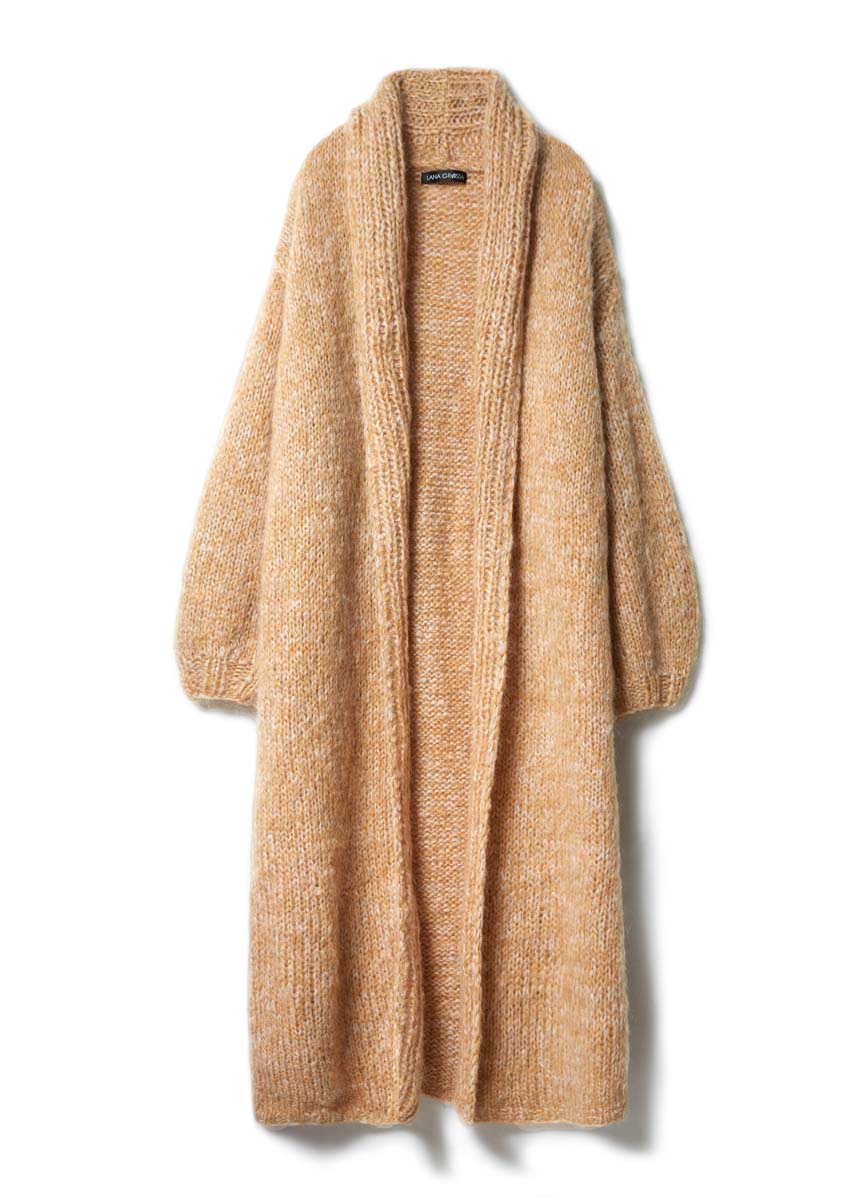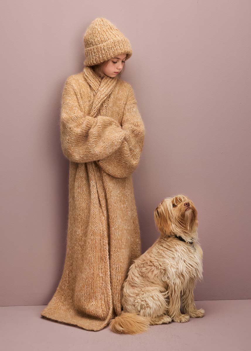 475 (500) г цвета вер- блюжьей шерсти (цв. 19) пряжи Brigitte No. 3 (57% шерсти мерино, 20% мохе- ра суперкид, 23% полиамида, 100 м/25 г) и 400 (450) г бежевой (цв. 11) пряжи Mohair Moda (70% мохера кид, 20% шер- сти мерино суперфайн, 10% полиамида, 140 м/50 г) фирмы Lana Grossa; прямые спицы № 8, крючок № 9.