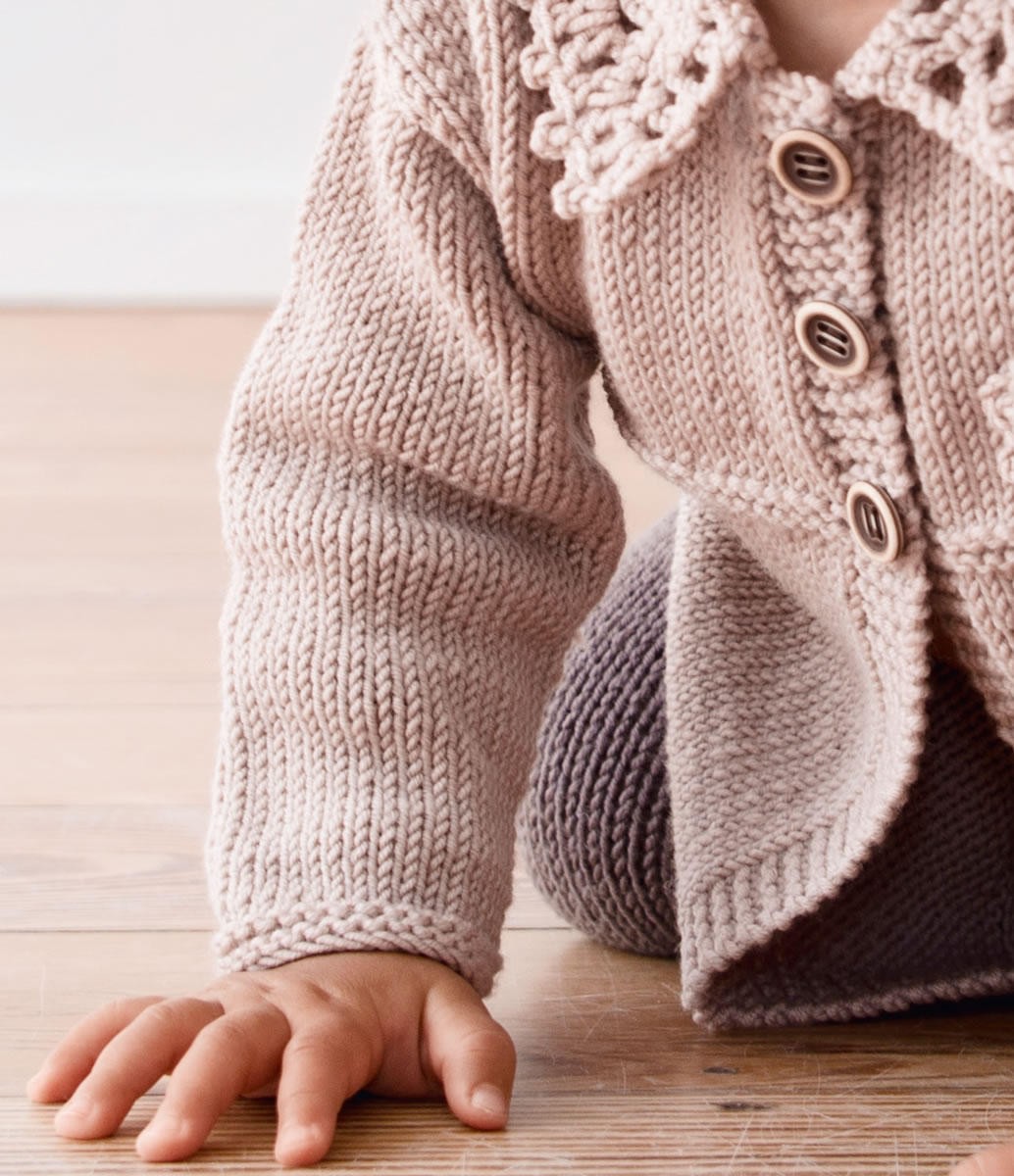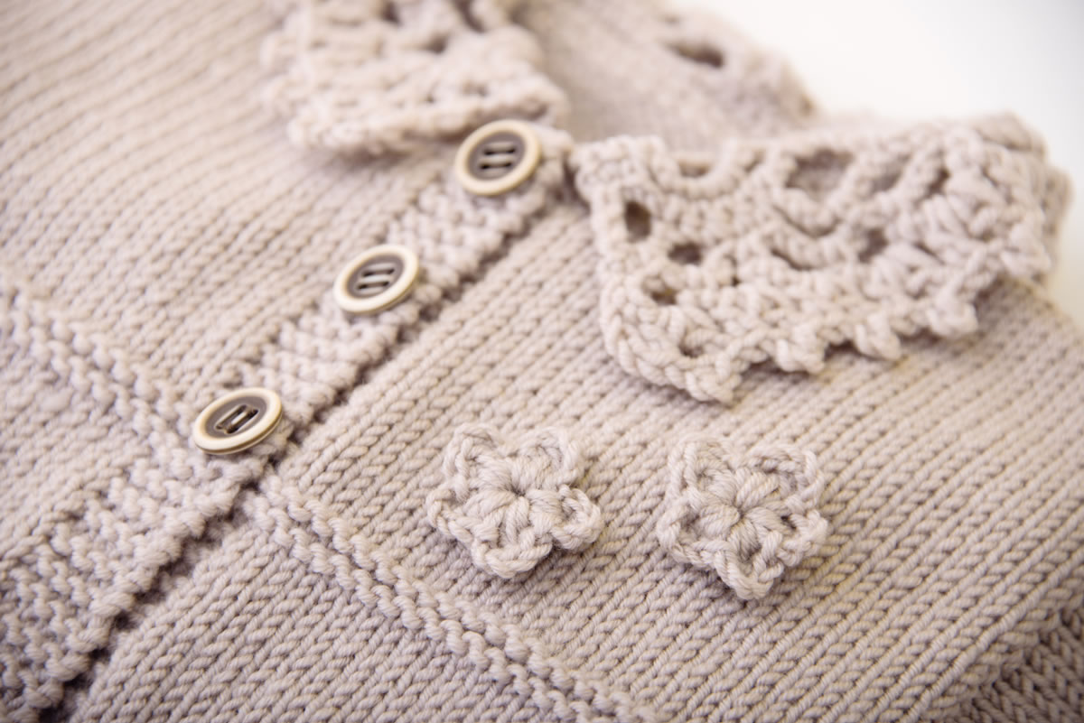 150 г цвета светлого розового дерева (цвет 936) пряжи Cool Wool Big фирмы Lana Grossa (100 % шерсти, 120 м/50 г); прямые спицы № 3,5, вязальный крючок № 3,5; 3 пуговицы.