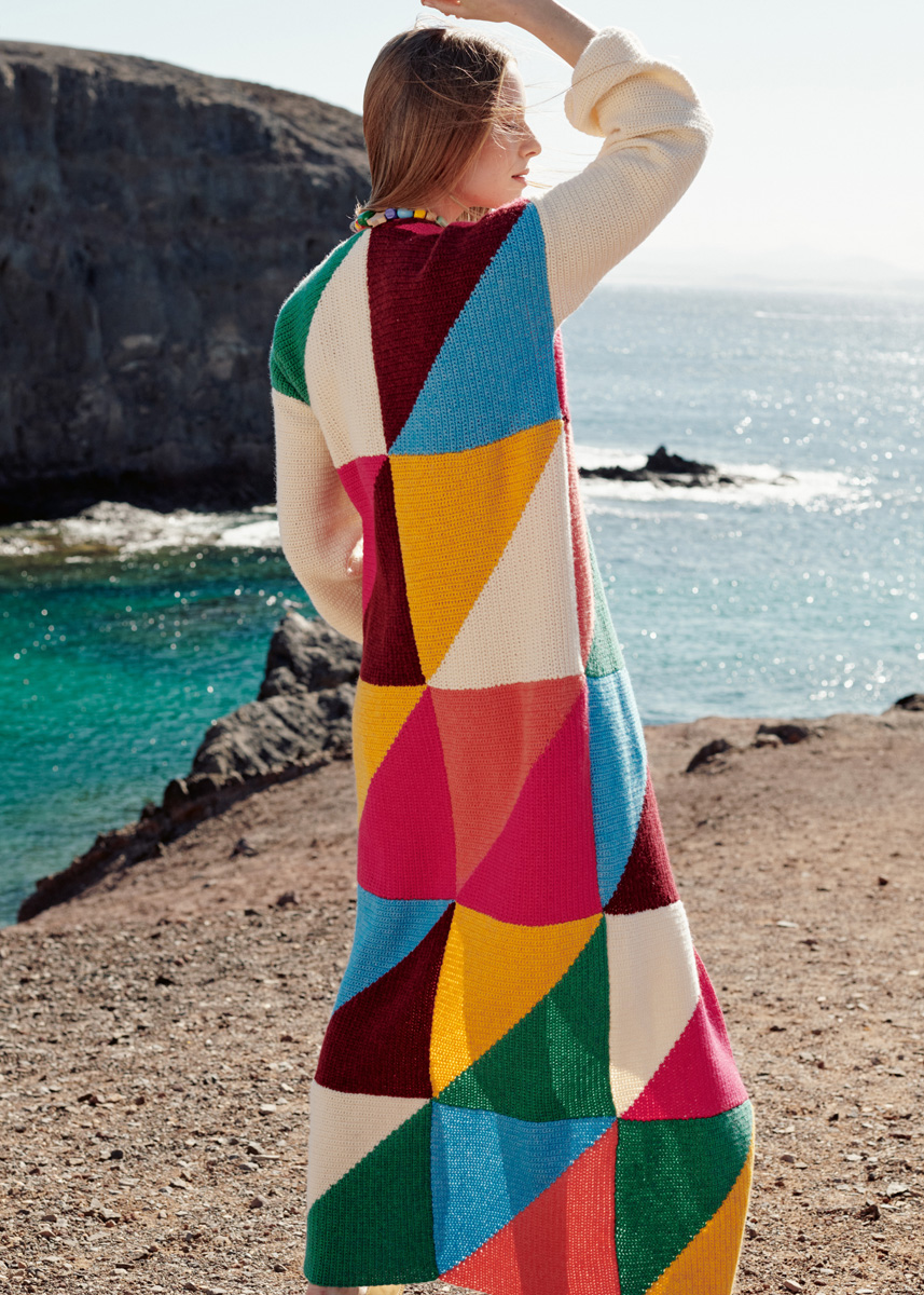 Lana Grossa Ecopuno (72% хлопок, 17% шерсть (меринос), 11% альпака (беби), длина нити 215 m/50 g), 300 г экрю (цв 46) и по 150 г зеленый (цв 41), жёлтый (цв 4), лососевый (цв 39), малина (цв 36), сине-бирюзовый (цв 29) и бордо (цв 35); 1 крючок № 3,5