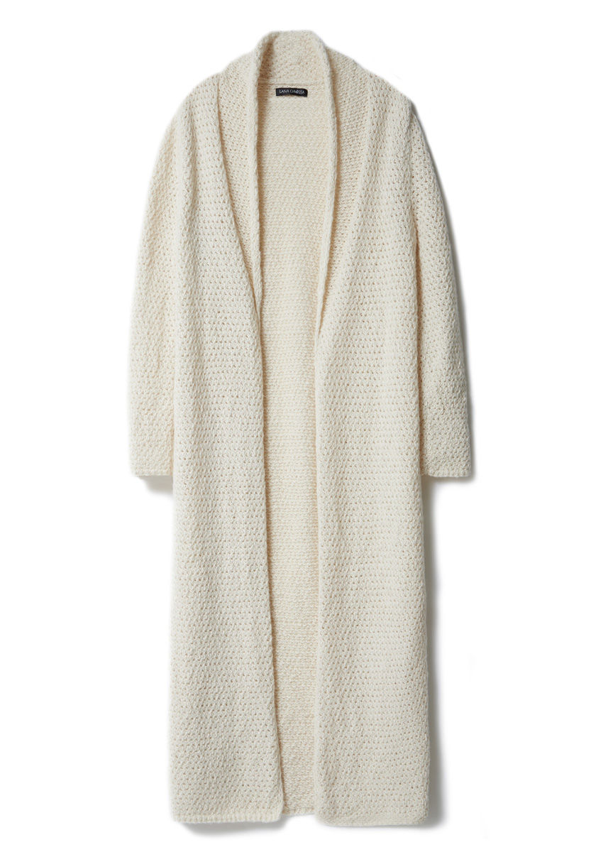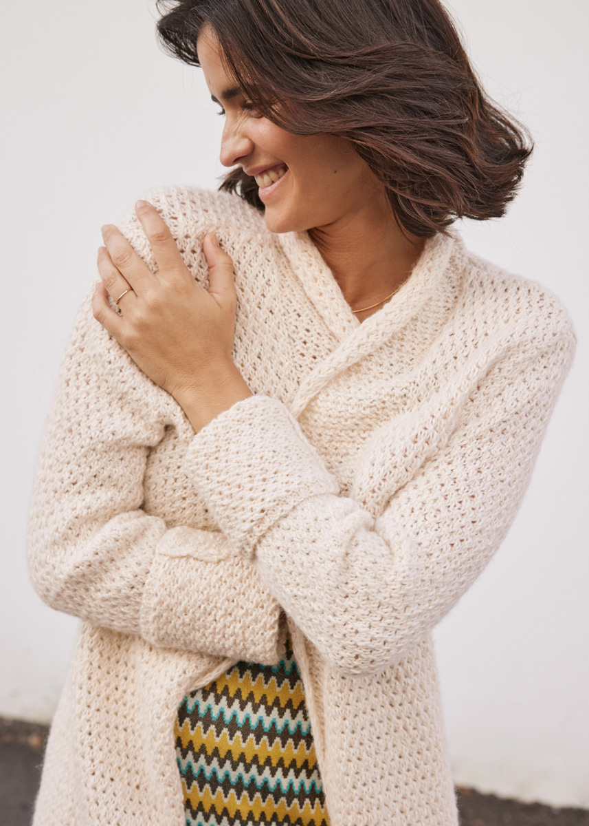 850 (950–1050) г неж- но-бежевой (цв. 2) пряжи Fantasia (50% хлопка, 24% вискозы, 16% альпака бэби, 10% шерсти мерино экстрафайн, 125 м/50 г) фирмы Lana Grossa; прямые спицы № 4,5
