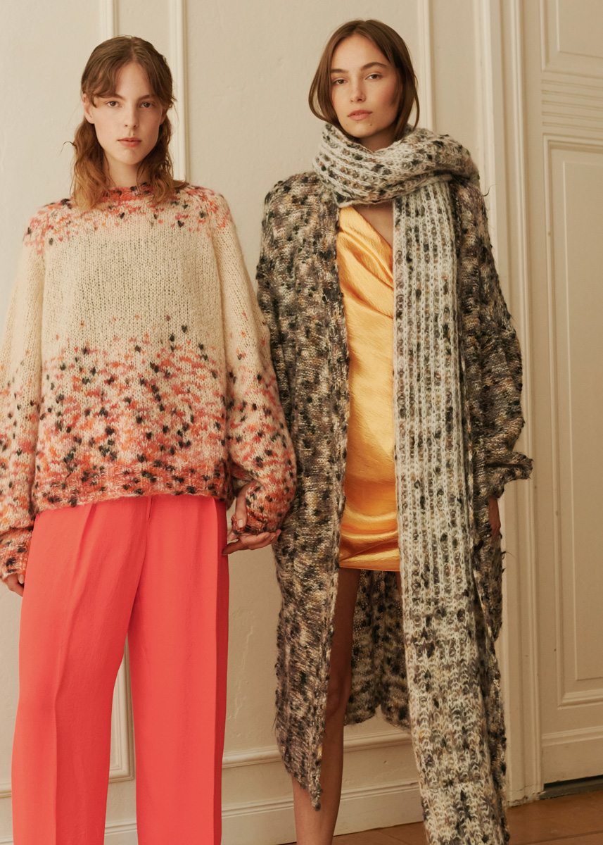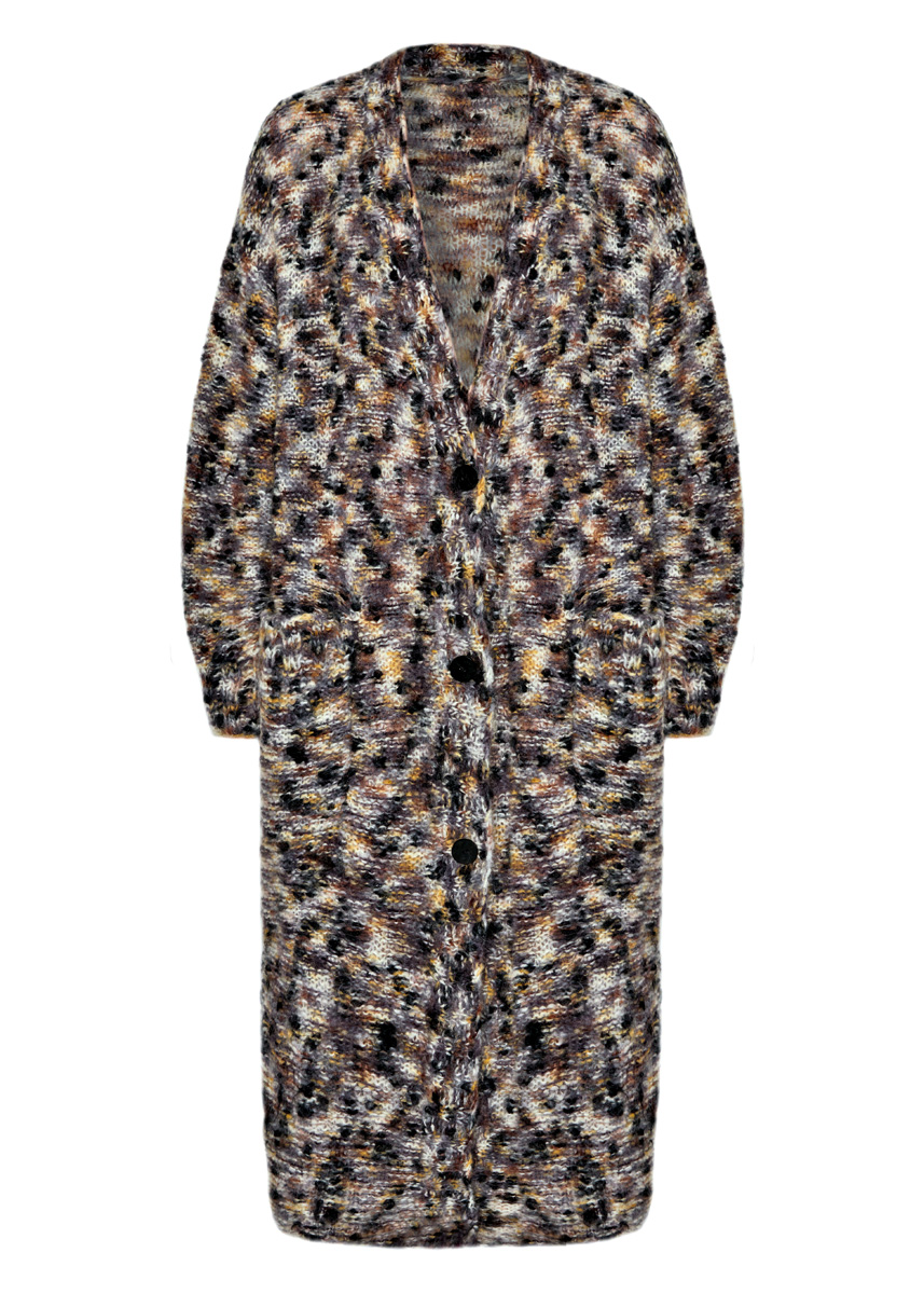 Lana Grossa-Qualität „Lala Berlin Brushy“ (42 % мохер (суперкид), 38 % шерсть (меринос), 20 % полиамид, длина нити 135 m/50 g): ок. 500 (550) г чисто-белый/желтый песок/антрацитовый/серо-коричневый (цв. 104); сп. № 6 и 7, 1 кр. сп. № 6, 120 см длиной; 3 пуговицы, 2-дырки, ø 25 мм
