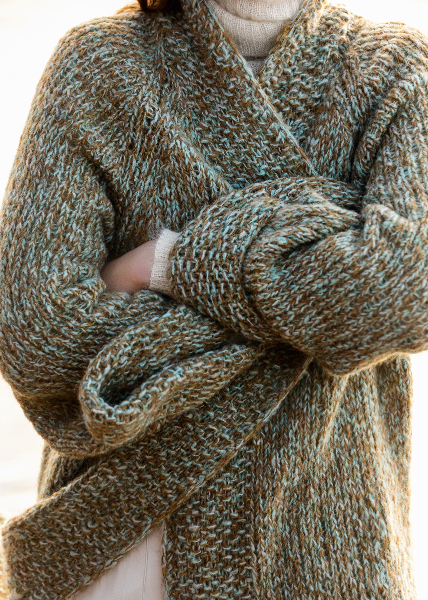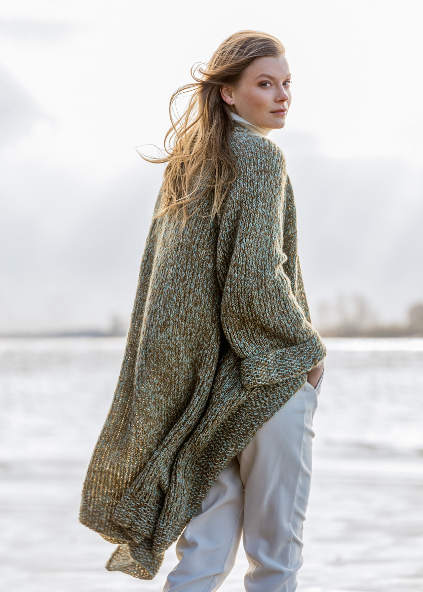 Lana Grossa-Qualität „Nuvoletta” (42 % альпака, 42 % меринос, 16 % полиамид, длина нити = ок. 250 m/50 g): по 250 (300 – 350) г легко коричневый (цв. 3) и пастельный бирюзовый (цв. 9); сп. № 8