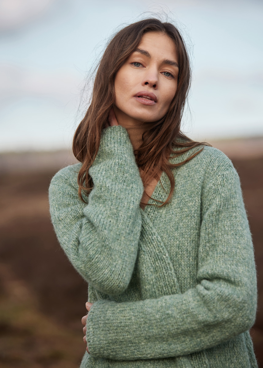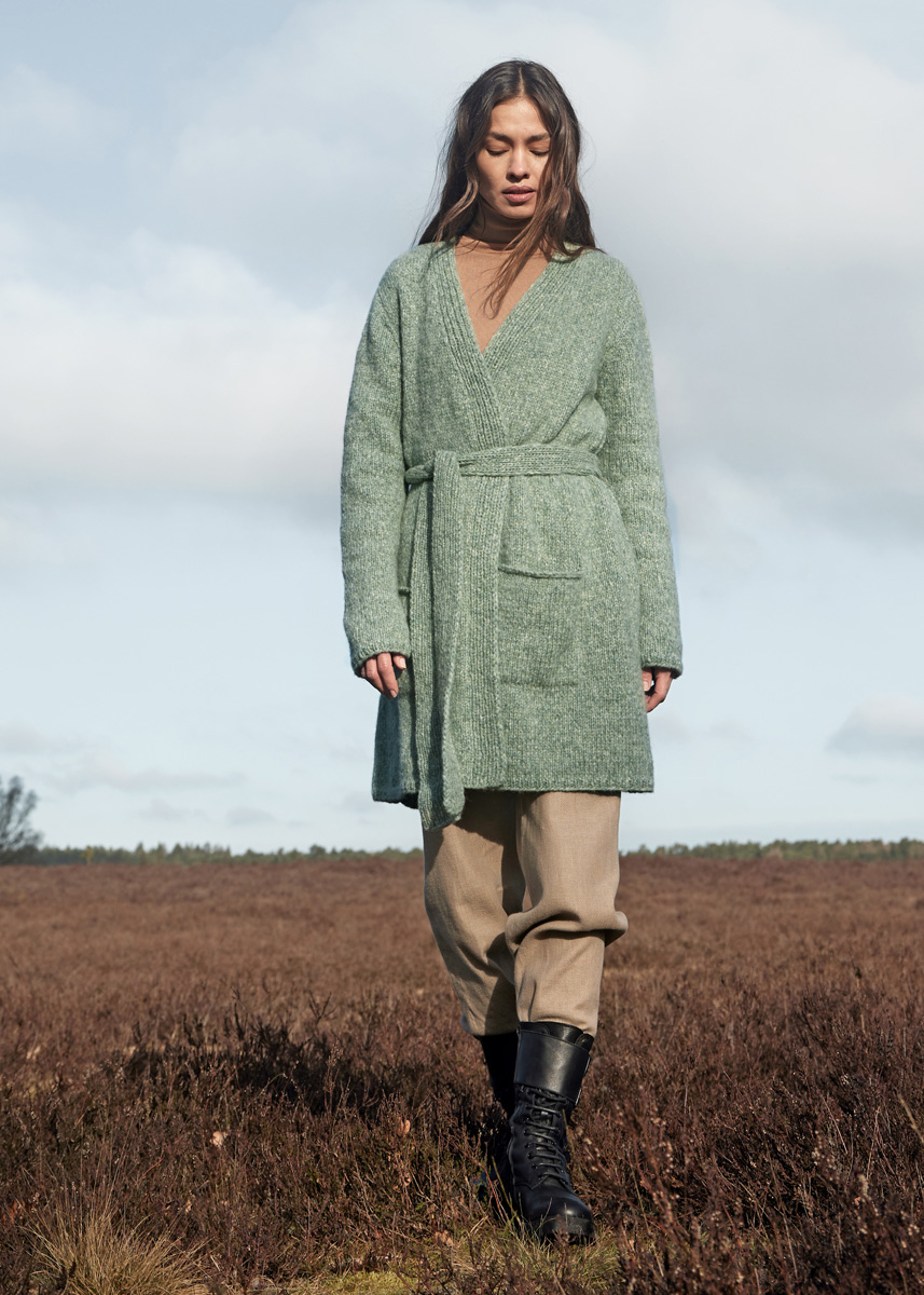 Lana Grossa-Qualität „Spuma“ (80 % альпака (меринос), 20 % полиамид, длина нити = ca 110 m/50 g): ca 650 (650–700–750) г серо зелёный (цв 11); сп. № 4,5, 5,5 и 6.
