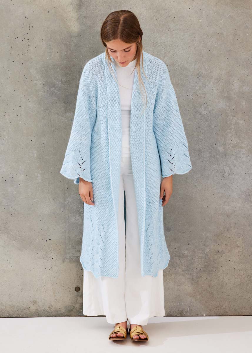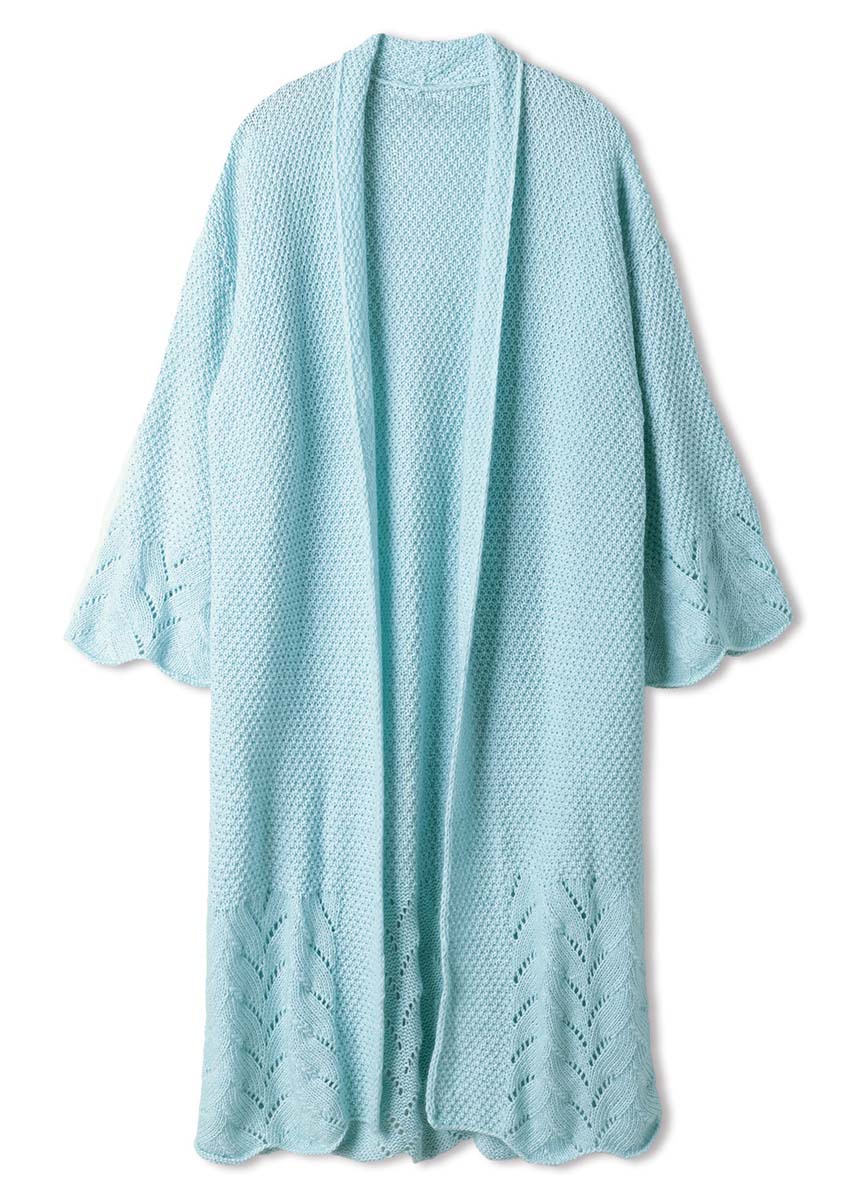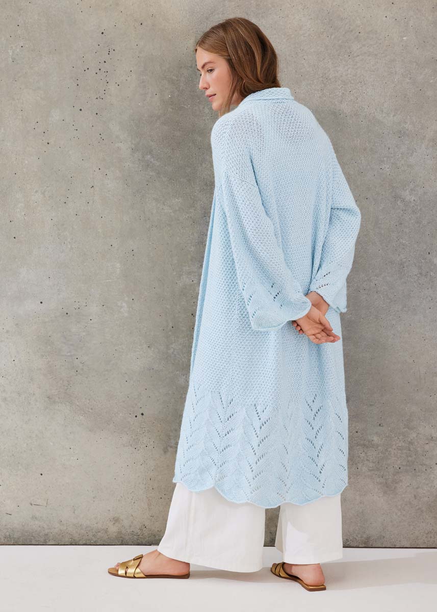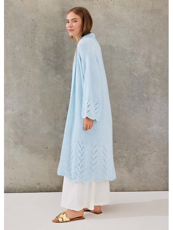 Lana Grossa-Qualität „Summer Softness“ (80 % хлопок (био), 20 % шерсть (меринос суперфейн), длина нити = ca 130 m/50 g): ок 800 (900) г пастельно синий (цв 17); сп. № 5,5.