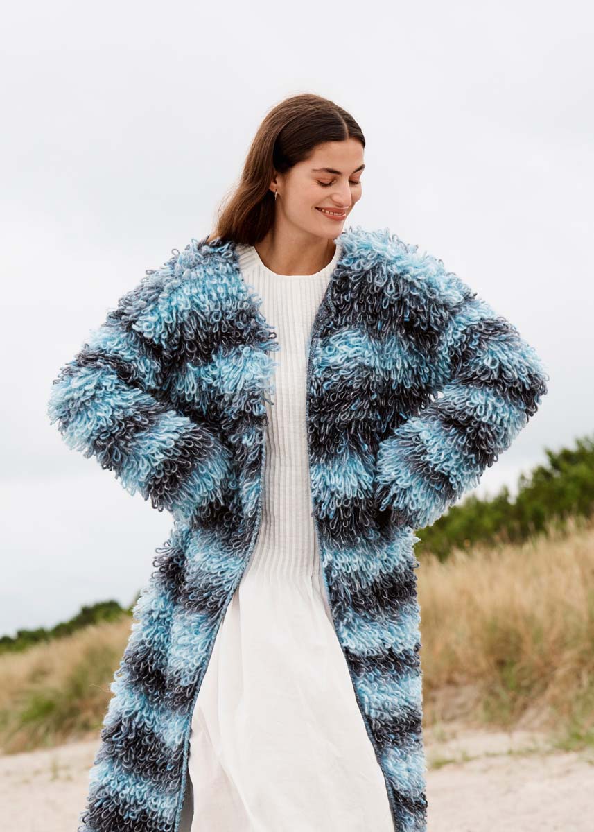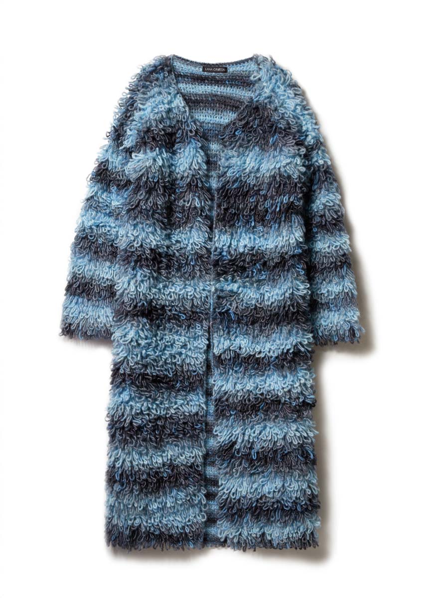 800 (850) г цвета антрацита/темно-/светло-серой/светло-бирюзовой/серо-синей (цв. 4) пряжи Picasso (36% шерсти мерино экстрафайн, 36% альпака бэби, 28% полиамида, 210 м/ 50 г) фирмы Lana Grossa; крючок № 6 и № 7.