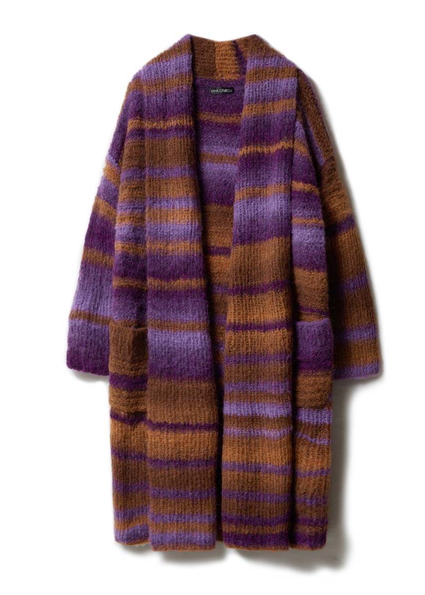 500 г лиловой/цвета ха- ки/цвета умбры/темно-фиолетовой/серо- лиловой (цв. 4) пряжи Gigante (70% аль- пака суперфайн, 30% полиамида, 300 м/ 100 г) фирмы Lana Grossa; прямые спицы № 7.