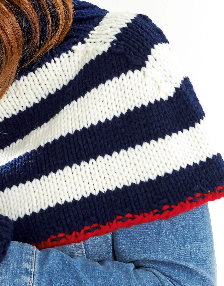 150 г темно-синей (цвет 12), 100 г белой (цвет 17) и 50 г винно-красной (цвет 9) пряжи Mille II фирмы Lana Grossa (50% шерсти мерино экстрафайн, 50% полиэстера, подходящего для машинной стирки, 55 м/50 г); круговые спицы № 7 длиной 60 и 100 см.