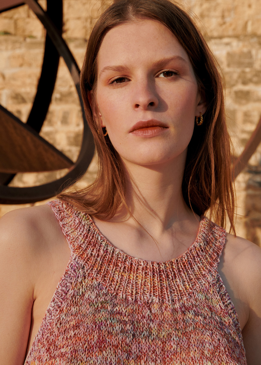 350 (450–500) г розо- вой/сиреневой/серо-зеленой/желтой/бе- ло-бежевой пестрой (цв. 01) пряжи About Berlin Vanity (54% хлопка, 21% вискозы, 13% шелка, 12% полиамида, 100 м/50 г) фирмы Lana Grossa; прямые спицы № 4 и № 4,5, круговые спицы № 4 длиной 40 см