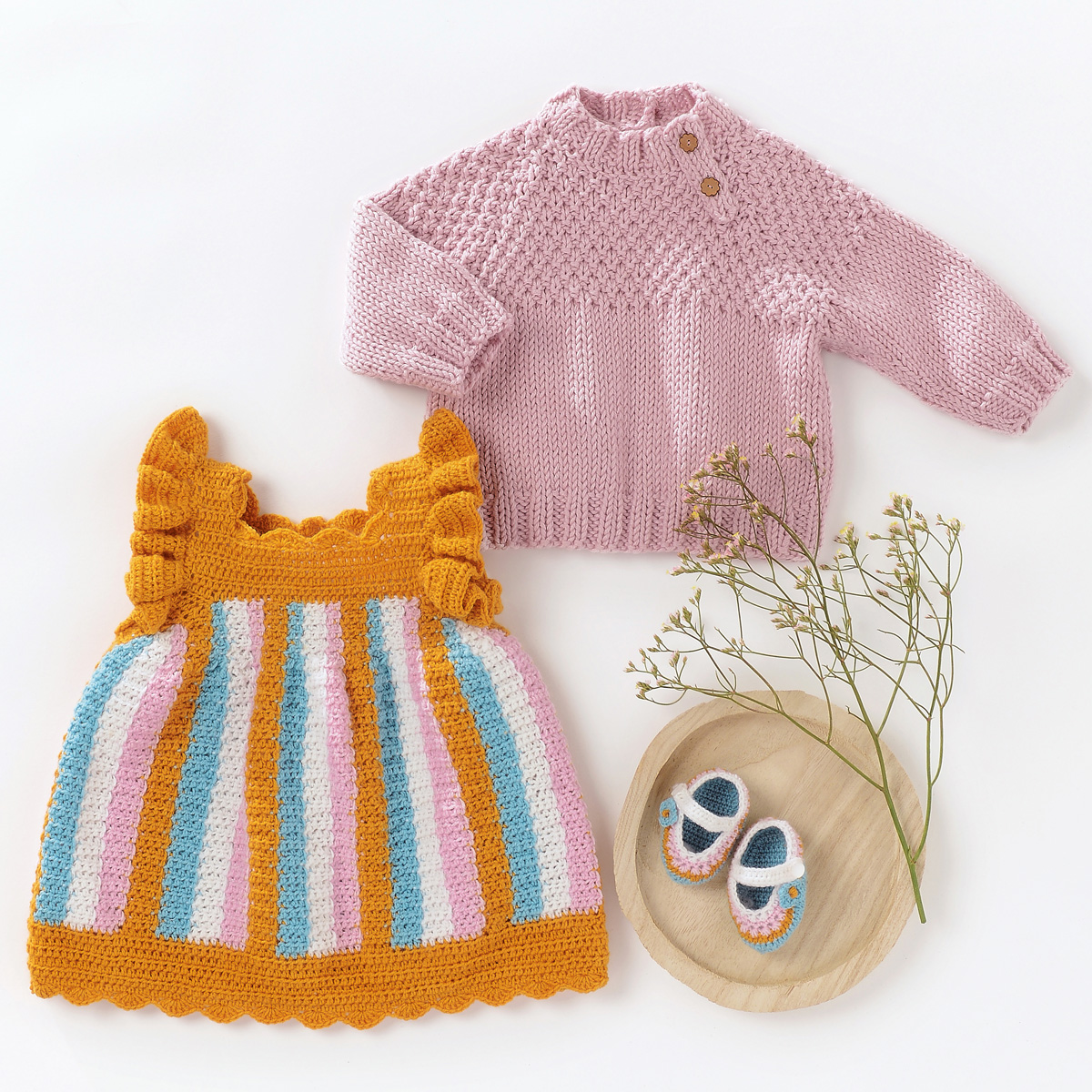Lana Grossa Cool Wool Baby (100 % шерсть, длина нитки 220 m/50 g) 100 (150/150/200) г оранжевый (цв 275), 100 г мята (цв 261), 50 г розовый (цв 216) и 50 г белый (цв 207); крючок № 3; 1 кнопка с 10 мм диам