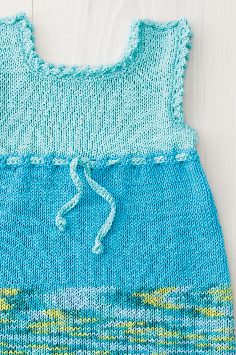 по 50 г бирюзовой (цв. 9) и цвета мяты (цв. 35) пряжи Cotone (100% хлопка, 125 м/50 г) и 50 г сине-зелено-бирюзовой (цв. 304) пряжи Cotone Print (100% хлопка, 25 м/50 г) фирмы Lana Grossa; короткие круг. спицы № 4,5; крючок № 4; 4 пуговицы