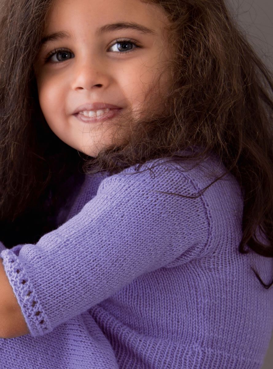 150 г лиловой (цвет 240) и 50 г светло-серой меланжевой (цвет 206) пряжи Cool Wool Baby фирмы Lana Grossa (100 % шерсти, 220 м/50 г); круговые спицы № 3 длиной 40 см, вязальный крючок № 2,5; 1 пуговица и резинка