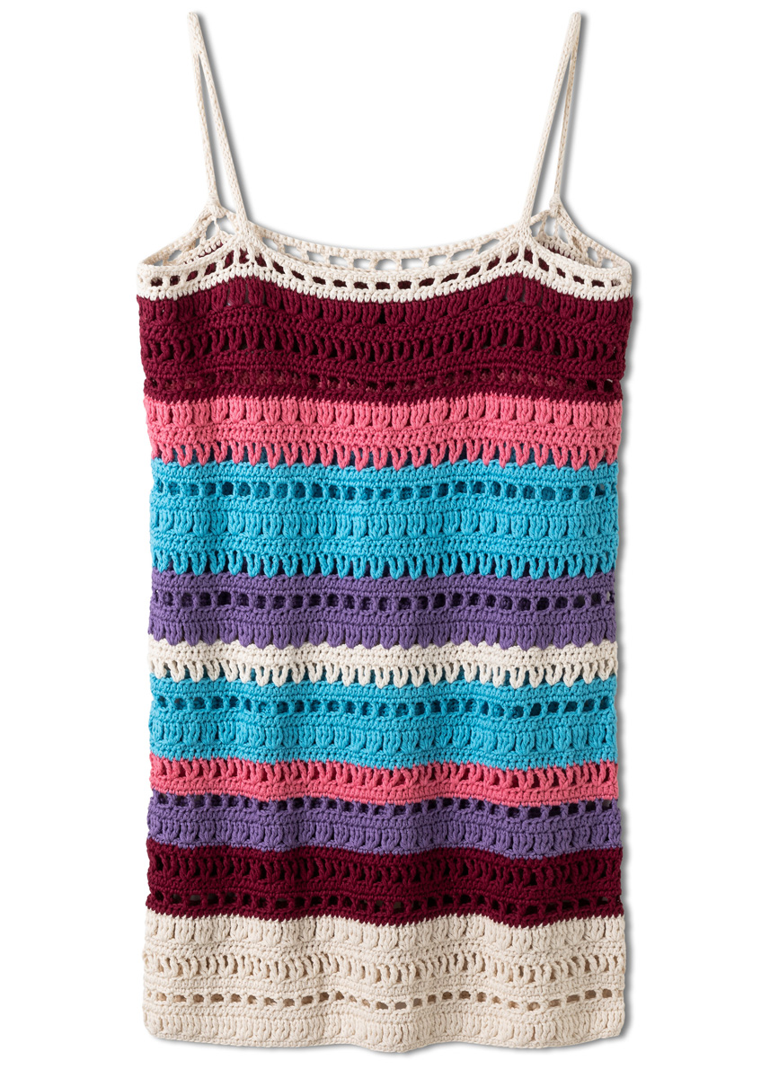 Lana Grossa-Qualität „Organico” (100 % (био) хлопок, длина нити = ок. 90 m/50 g): по ок. 150 г экрю (цв. 6) и бирюзовый (цв. 115), по ок. 100 г ориент красный (цв. 137) и фиолетовый (цв. 151) и ок. 50 г пинк (цв. 150); 1 крючок № 4,5, 2 чул. сп. № 5