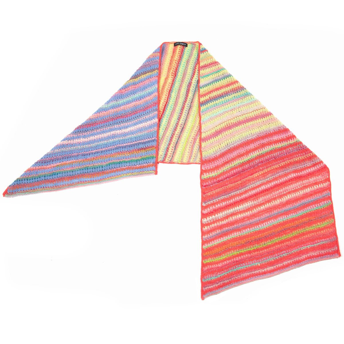 Lana Grossa Colorissimo (100% шерсть (меринос), длина нити 300 m/100 g), 200 г лососевый/коралловый/ шафранный/жёлтый/ бирюзовый/сирень (цв 11) и Lana Grossa Allora (76% хлопок, 14% шерсть (меринос), 10% альпака, длина нити 300 m/50 g), 50 г коралловый (цв 19), 50 г желто зелёный (цв 2) и 50 г синяя фиалка (цв 26); сп. № 4 и 1 кр. сп. № 4, длиной 120 см