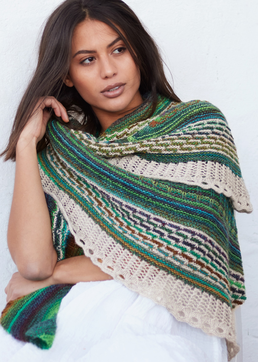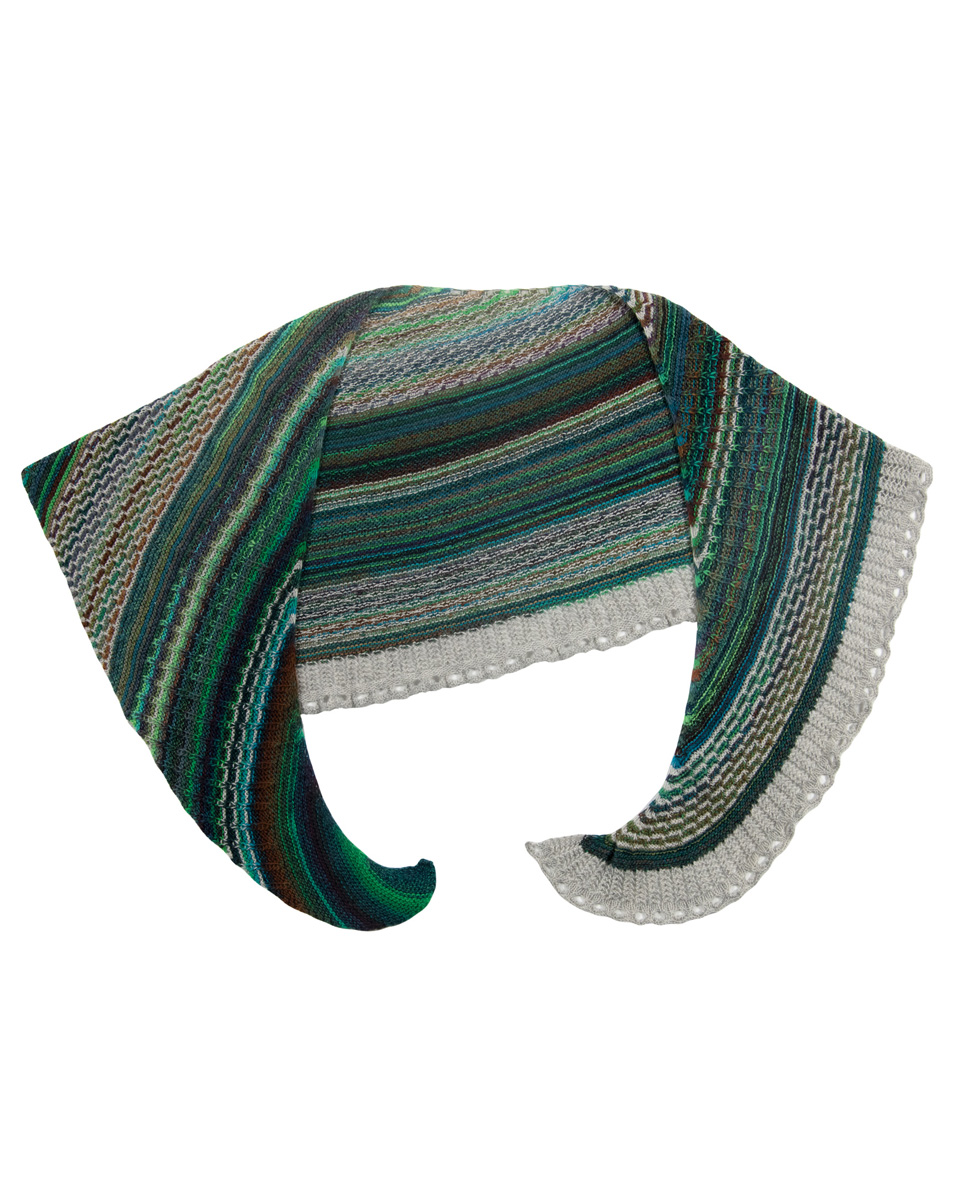 Lana Grossa Colorissimo (100% шерсть (меринос), длина нити 300 m/100 g), 300 г бежевый/ бирюзовый/светло-зелёный/петроль/легко коричневый/ красно-коричневый (цв 4) и Lana Grossa Ecopuno (72% хлопок, 17% шерсть (меринос), 11% альпака, длина нити 215 m/50 g), 100 г светло серый (цв 14); по 1 кр. сп. № 4 и 4,5, 100 см длиной.