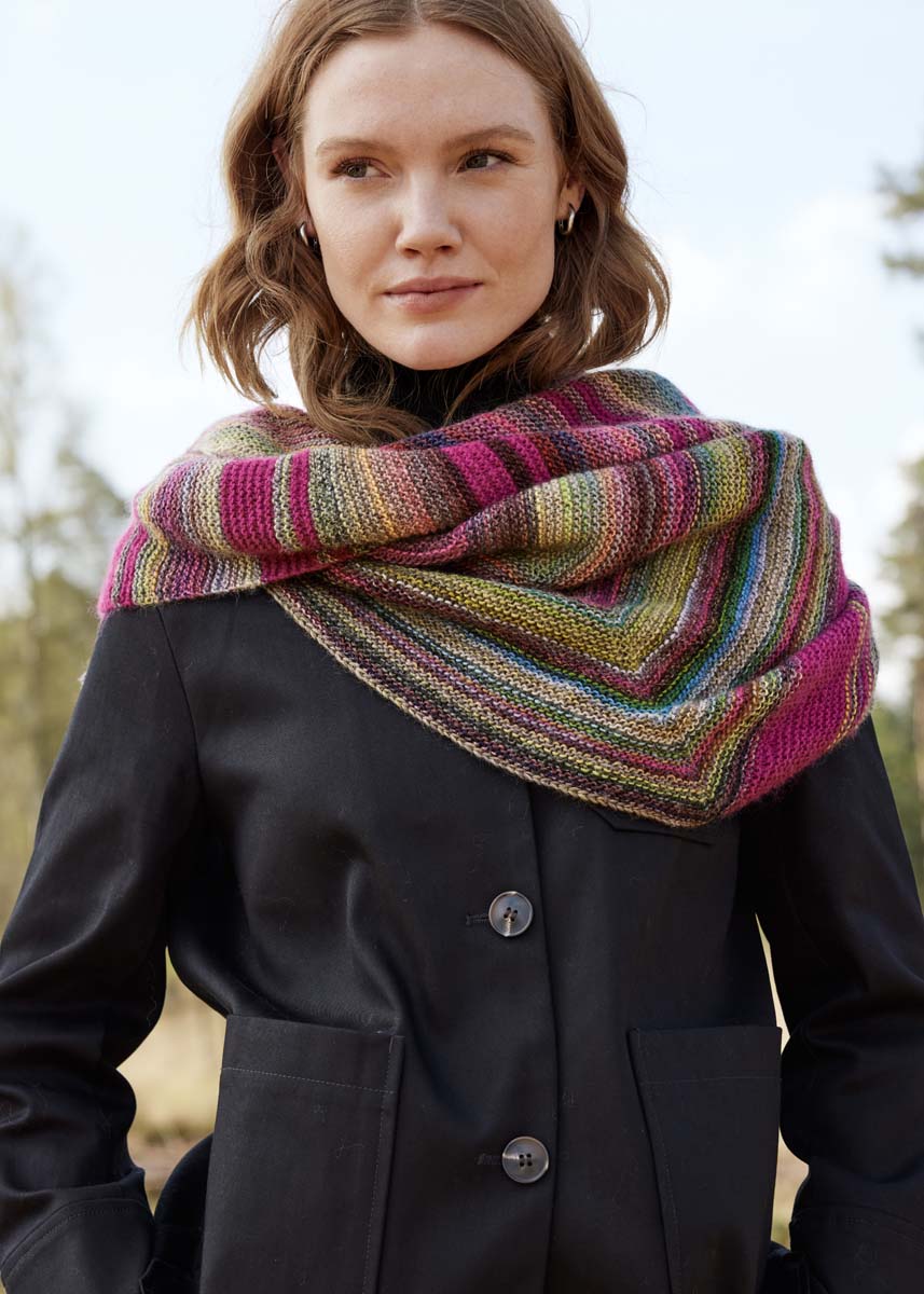 Lana Grossa Colorissimo (100% шерсть (меринос), длина нити 300 m/100 g), 200 г лайм/оливково- зелёный /светло-серый/тёмно-серый/серо-синий/серо- коричневый/серо-коричневый/пинк/тёмно-зелёный/серо- фиолетовый (цв. 217), Lana Grossa Ecopuno (72% хлопок, 17% шерсть (меринос), 11% альпака (беби), длина нити 215 m/50 g), 50 г пурпурный (цв. 22), кр. сп. № 4