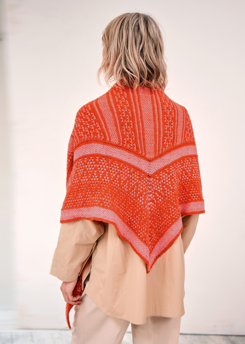 Lana Grossa Ecopuno (72 % хлопок, 17 % шерсть (меринос), 11 % альпака (беби), длина нити 215 m/50 g), 150 г оранжево-красный (цв 34) и Lana Grossa Ecopuno Dégradé (70 % хлопок, 19 % шерсть (меринос), 11 % альпака (беби), длина нити 380 m/100 g), 200 г красный/розовый (цв 402); 1 кр. сп. № 4,5, 100 см