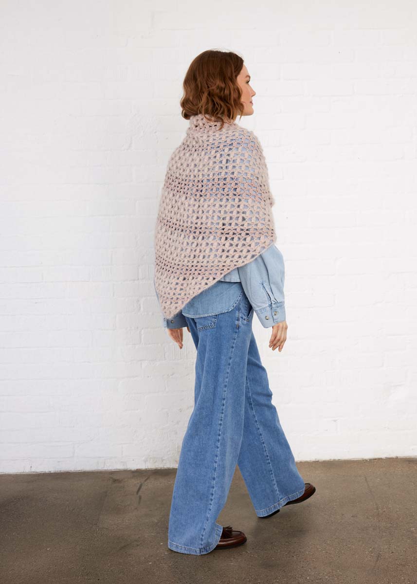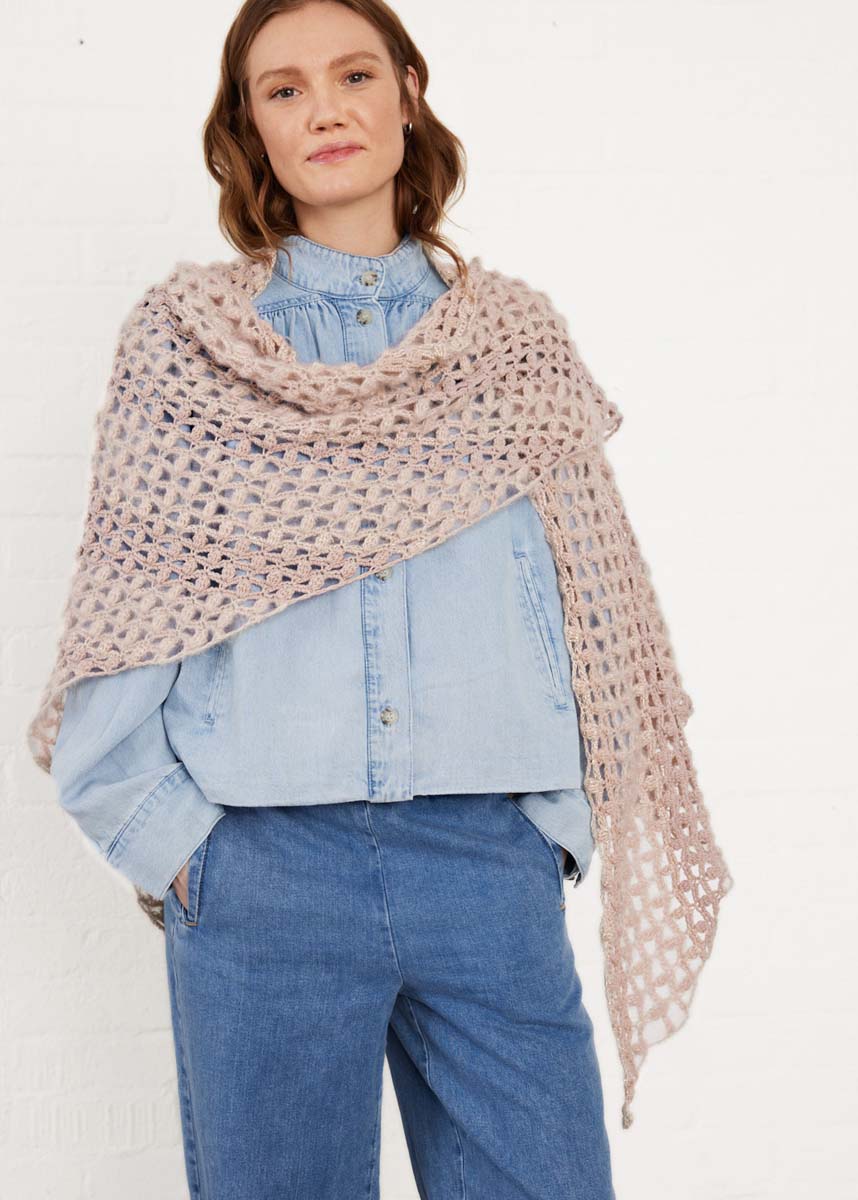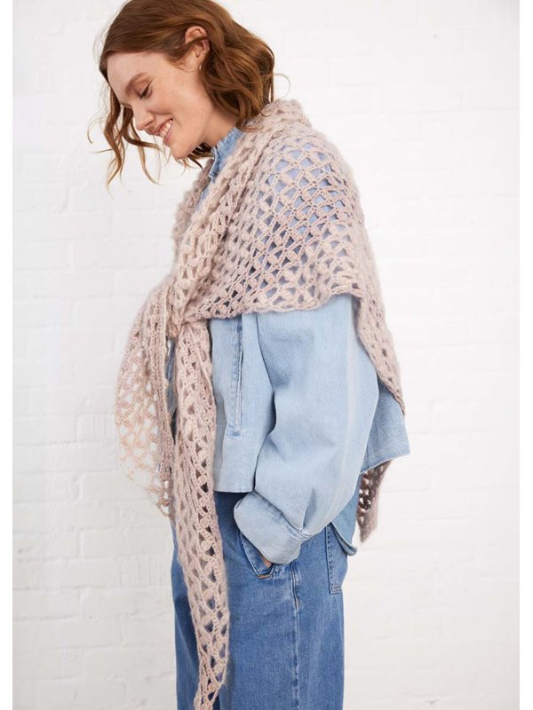 Lana Grossa Ecopuno (72% хлопок, 17% шерсть (меринос), 11% альпака (беби), длина нити 215 m/50 g), 150 г бежевый песок (цв. 64), Lana Grossa Silkhair (70% мохер (суперкид), 30% шёлк, длина нити 210 m/25 g), 125 г светло бежевый (цв. 18) и Lana Grossa Brillino (83% вискоза, 17% металл. волокно, длина нити 200 m/25 g), 50 и белый/золотой (цв. 9); 1 крючок № 4,5