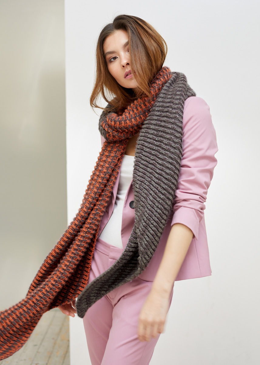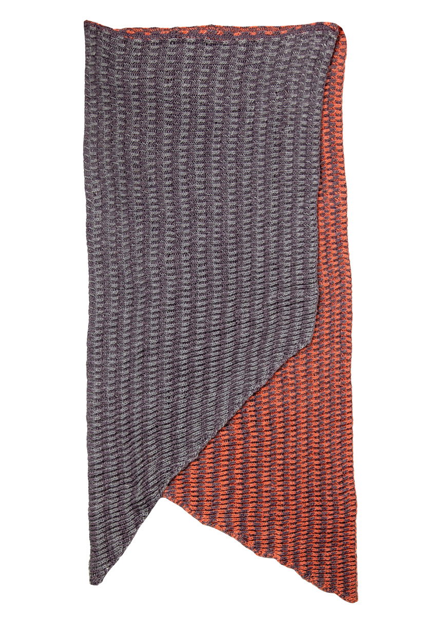 250 г сливовой (цв. 5), 150 г желто-красной (цв. 8) и 100 г серой (цв. 14) пряжи Lace Seta Mulberry (35% (тутового) шелка, 35% шерсти ягненка альпака, 30% мериносовой шерсти экстра- файн, 175 м/50 г) фирмы Lana Grossa; кру- говые спицы № 3,5 длиной 120 см и крю- чок № 3,5