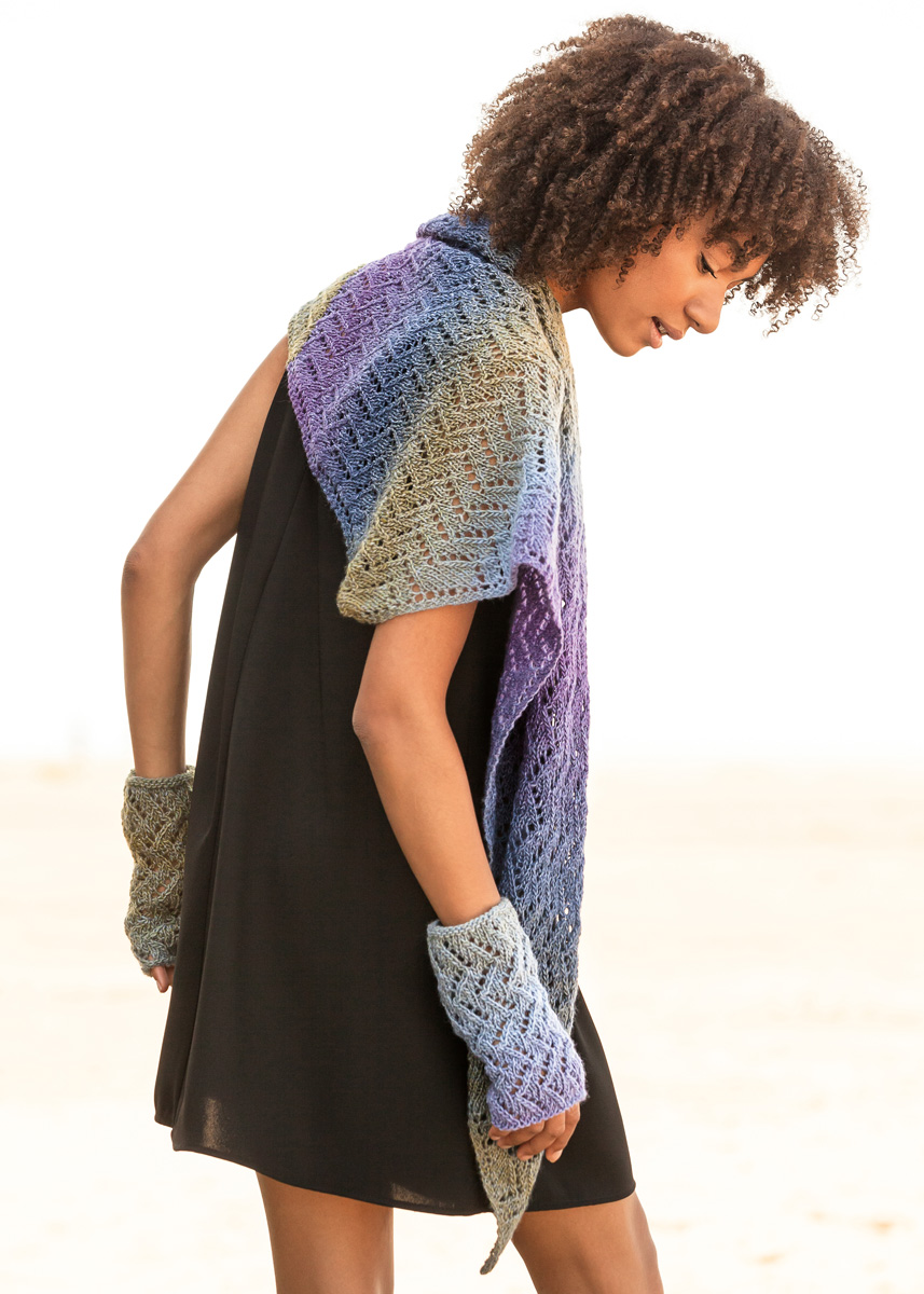 Lana Grossa Gomitolo Versione (50% шерсть, 50% полиакрил, длина нити 700 m/200 g), 200 г сине-фиолетовый/ синяя фиалка/оливковый/ серо-зеленый (цв 422); 1 кр. сп. № 5, длиной 80 см и 1 чул. сп. № 4,5