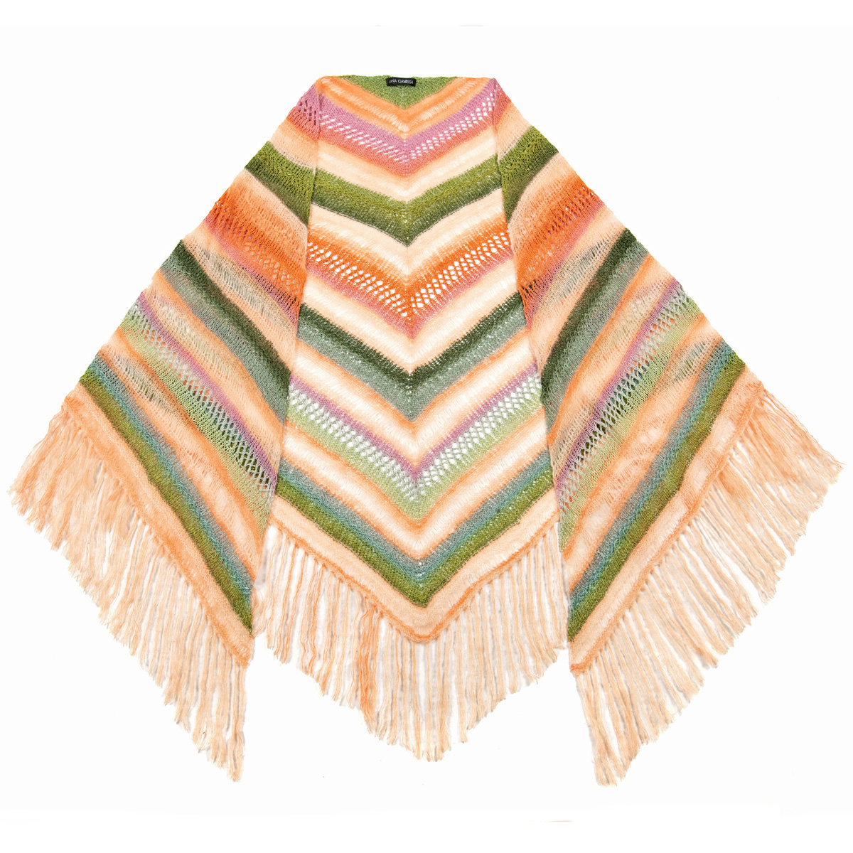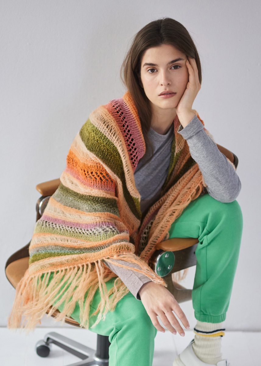 Lana Grossa Mare (50% лён, 33% шёлк, 17% хлопок, длина нити 330 m/100 g), 100 г тростник/персик/лососевый/ оранжевый/светло-серый/ розовый/ пинк (цв 1) и 100 г петроль зелёный/бирюзовый/нефрит/легко коричневый/ нуга (цв 2) и Lana Grossa Setasuri Dégradé (69% альпака, 31% шёлк, длина нити 424 m/50 g), 50 г персик/лососевый/ оранжевый (цв 104); сп. № 5, 1 кр. сп. № 5, длиной 100 см, 1 крючок № 4,5 для бахромы и 1 маркировка