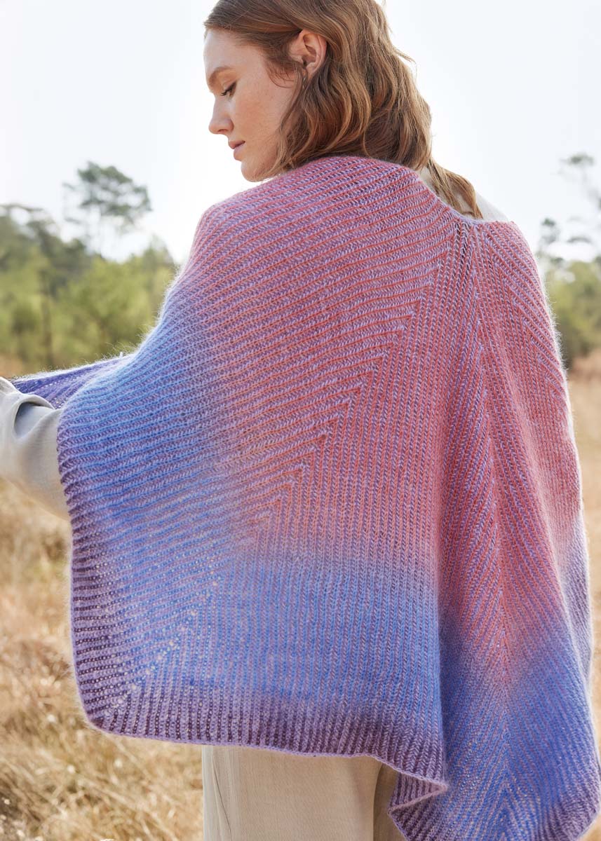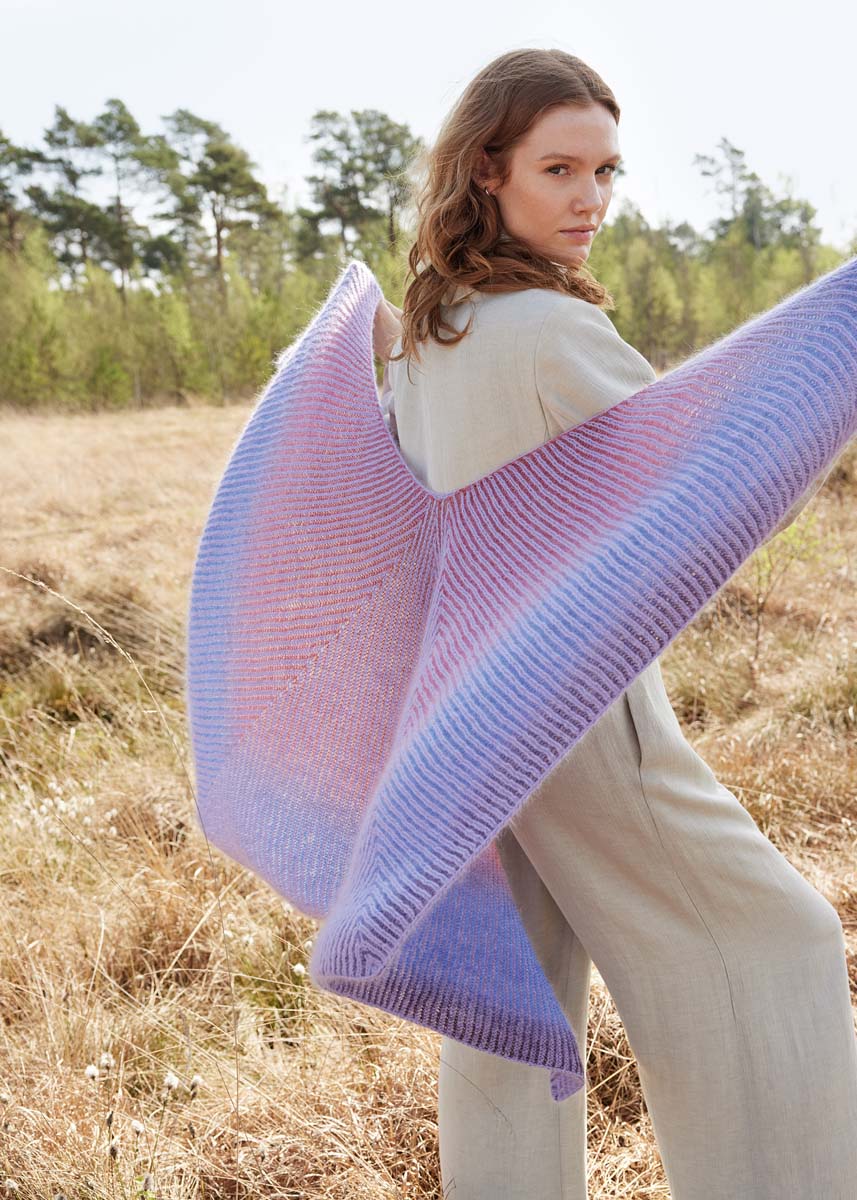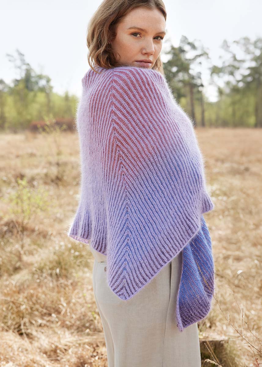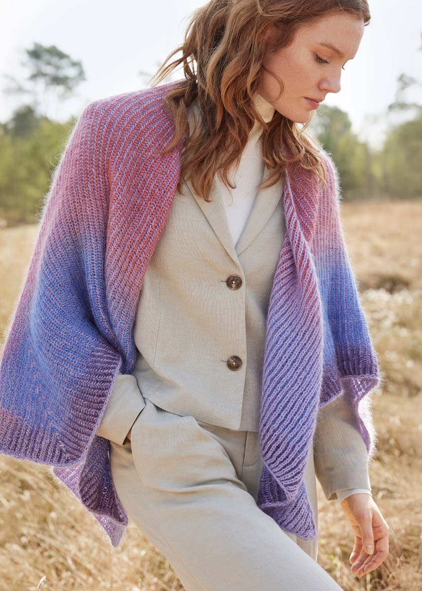 Lana Grossa Merino Lace Aquarell (100% шерсть (меринос), длина нити 800 m/100 g), 100 г в темно серо фиолетовый/лазурь/лосось красный (цв. 17), Lana Grossa Silkhair (70% мохер (суперкид), 30% шёлк, длина нити 210 m/25 g), 100 г сирень (цв. 173) и Lana Grossa Cool Wool Lace (100% шерсть (меринос), длина нити 400 m/50 g), 100 г в лиловый (цв. 47); 1 кр. сп. № 4, 120 см, 3 маркировки.