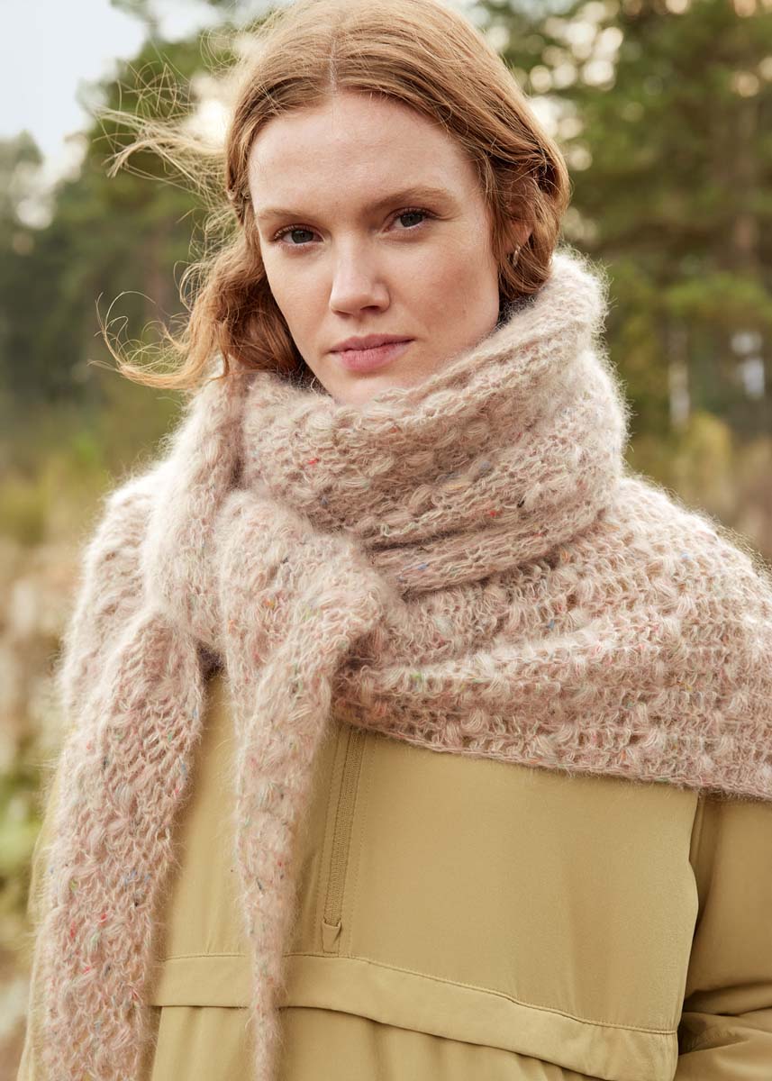 Lana Grossa Natural Superkid Tweed (60% мохер (суперкид), 30% шёлк, 7% хлопок, 3% полиэстер, длина нити 200 m/25 g), по 125 г натуральный (цв. 614) и розовый (цв. 629); 1 крючок № 5,5