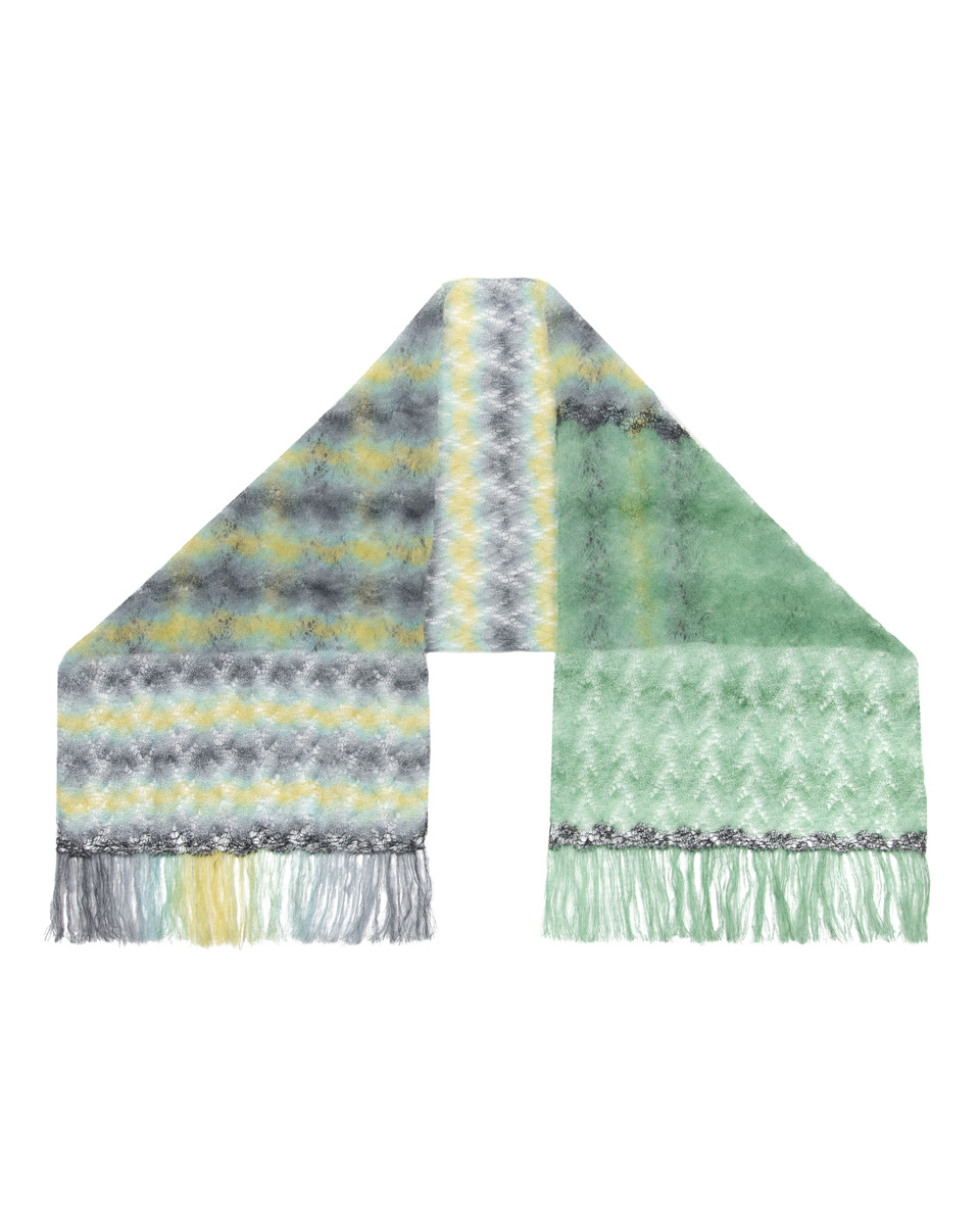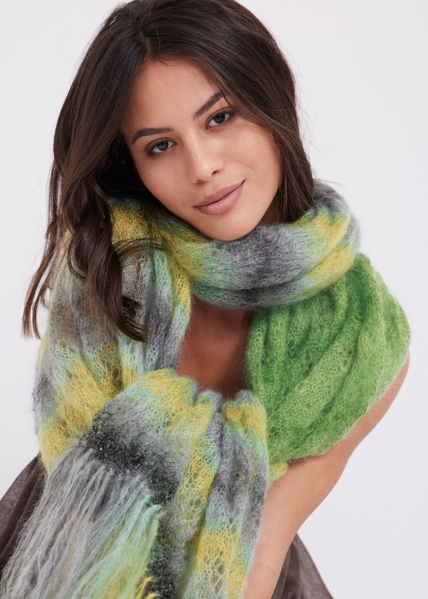 Lana Grossa Silkhair Haze Print (70% мохер, 30% шёлк, длина нити 425 m/50 g), 100 г бирюзовый/светло- оливковый/средне-серый/тёмно-серый/антрацитовый (цв 1217), Lana Grossa Silkhair Haze Dégradé (70% мохер, 30% шёлк, длина нити 425 m/50 g), 50 г пастельно-зелёный/мох зеленый (цв 1113) и Lana Grossa Diamante (100% полиэстер, длина нити 195 m/25 g), 25 г антрацитовый (цв 12); сп. № 5 и 1 крючок № 4,5 для бахромы