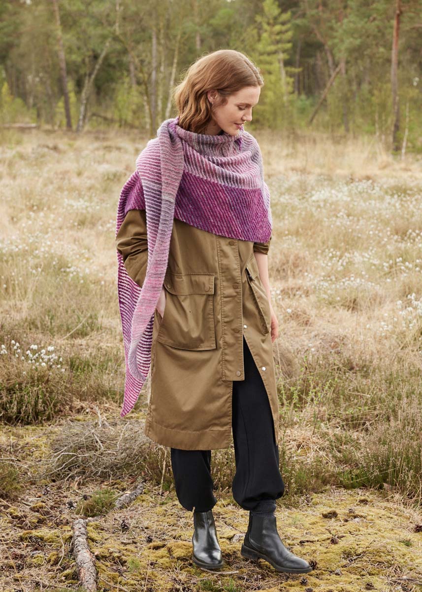 Lana Grossa Silkhair Print (70 % мохер (суперкид), 30 % шёлк, длина нити 210 m/25 g), 75 г пинк/бордо/светло- серый/серо-фиолетовый (цв. 435), Lana Grossa Cashmere 16 Fine (80 % шерсть (меринос), 10 % кашемир, 10 % полиамид, длина нити 320m /50g), по 50 г темная фуксия (цв 59), розовый (цв 60) и розовое дерево (цв 1), кр. сп. № 4, 100 см
