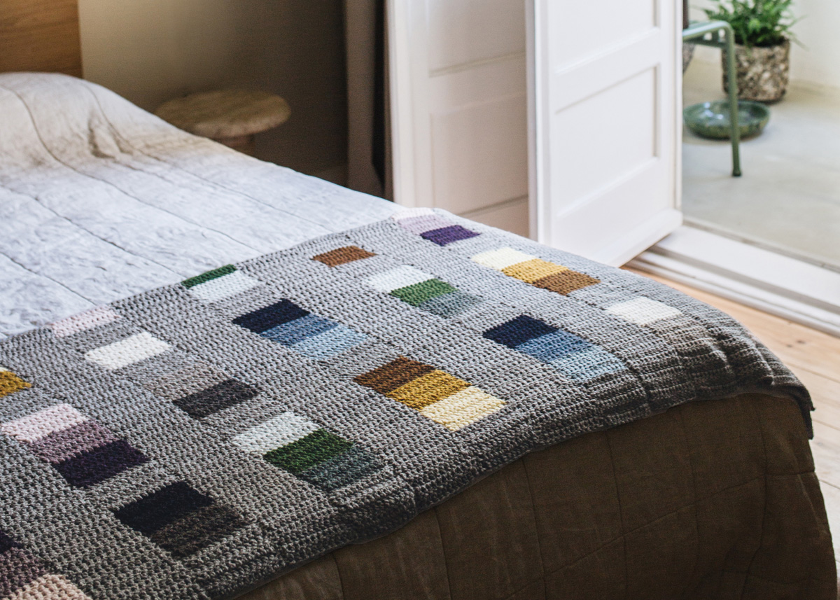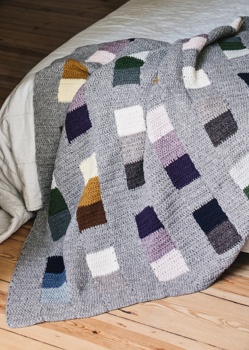 1500 г светло-се- рой меланжевой (цв. 12), по 50 г па- стельно-желтой (цв. 83), цвета охры (цв. 73), цвета сиены (цв. 77), светлой джинсово-синей (цв. 81), серо-синей меланжевой (цв. 60), иссиня-черной (цв. 5), пастельно-синей (цв. 82), ка- муфляжной зеленой (цв. 79), буты- лочно-зеленой (цв. 80), белой суро- вой (цв. 14), серой/бежевой меланже- вой (цв. 15), цвета мокко меланжевой (цв. 10), сиреневой меланжевой (цв. 44), нежно-розовой (цв. 84) и цвета баклажана (цв. 75) пряжи Alta Moda Alpaca (90% шерсти (ягненка) альпа- ка, 5% овечьей (мериносовой) шерсти, 5% полиамида, 140 м/50 г) фирмы Lana Grossa; крючок № 5,5