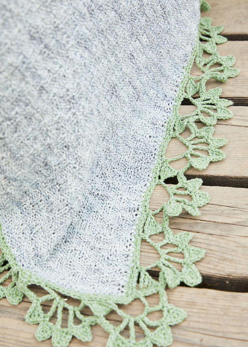 Lana Grossa-Qualität „Landlust-Sommerseide“ (50% шёлк, 50% хлопок, длина нити 170 m/50 g), 600 г мята/джинс/серый (цв 106) и 150 г зелёное яблоко (цв 36); 1 кр. сп. № 4, длиной 100 см, 1 крючок № 3,5
