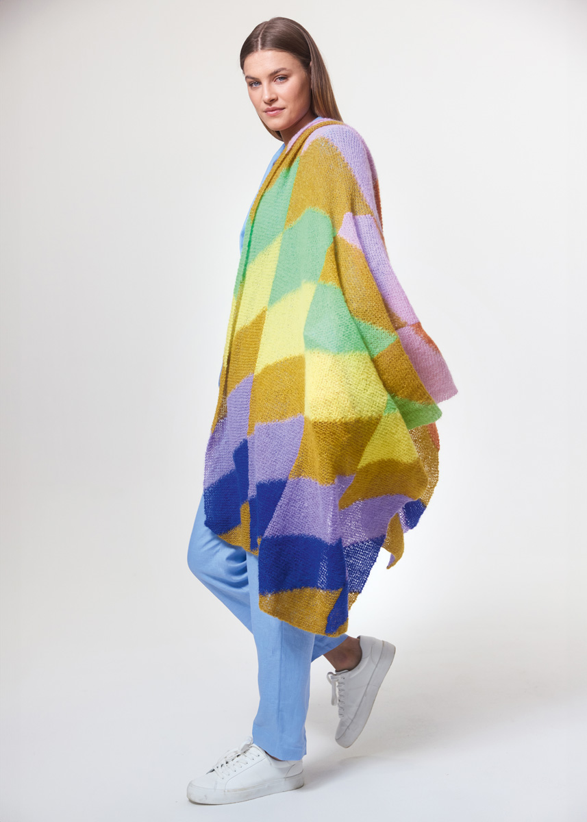 Lana Grossa Setasuri (69% альпака (сури), 31% шёлк, длина нити 212 m/25 g), 75 г мед желтый (цв. 65), 50 г фиолетовый (цв. 46), 50 г королевский (цв. 54), 25 г красная герания (цв. 47), 25 г зелёная весна (цв. 51), 25 г светло жёлтый (цв. 39) и 25 г ржавчина оранжевая (цв. 63); сп. № 4,5.