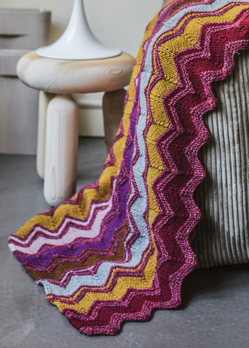 300 г красной/ро- зовой/серой/темно-красной (цв. 101), 150 г темно-красной (цв. 1), 100 г цвета фуксии (цв. 2), 100 г золоти- сто-желтой (цв. 8) и по 50 г цвета нуги (цв. 9), розовой (цв. 10), цвета верблюжьей шерсти (цв. 11) и свет- ло-серой (цв. 13) пряжи Cool Merino (90% овечьей (мериносовой) шерсти, 10% полиамида, 150 м/ 50 г) фирмы Lana Grossa; прямые спицы № 5,5