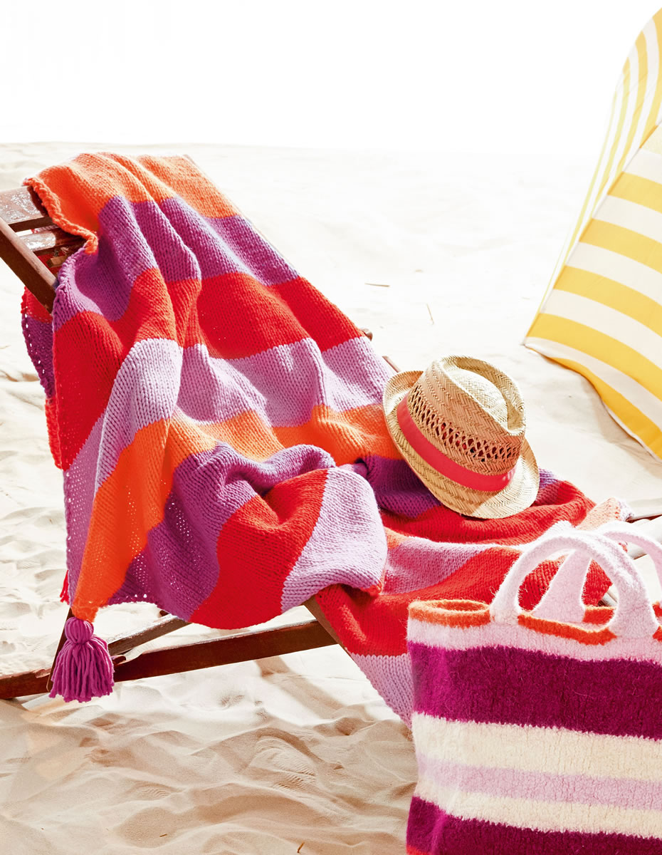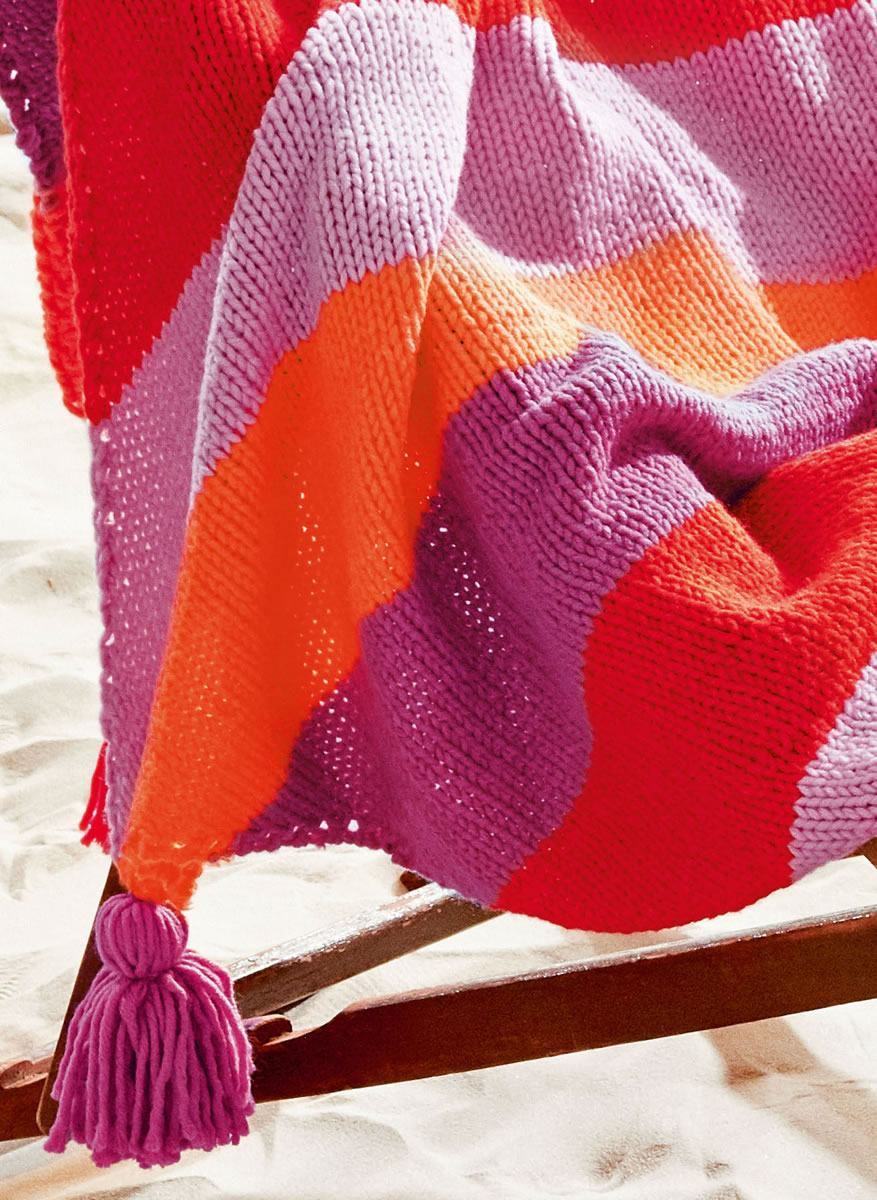 по 350 г неоново-оранжевой (цвет 503), вересковой (цвет 76), розовой (цвет 59) и ярко-красной (цвет 74) пряжи Mille II фирмы Lana Grossa (50 % шерсти, 50 % полиакрила, 55 м/50 г), прямые спицы № 7.