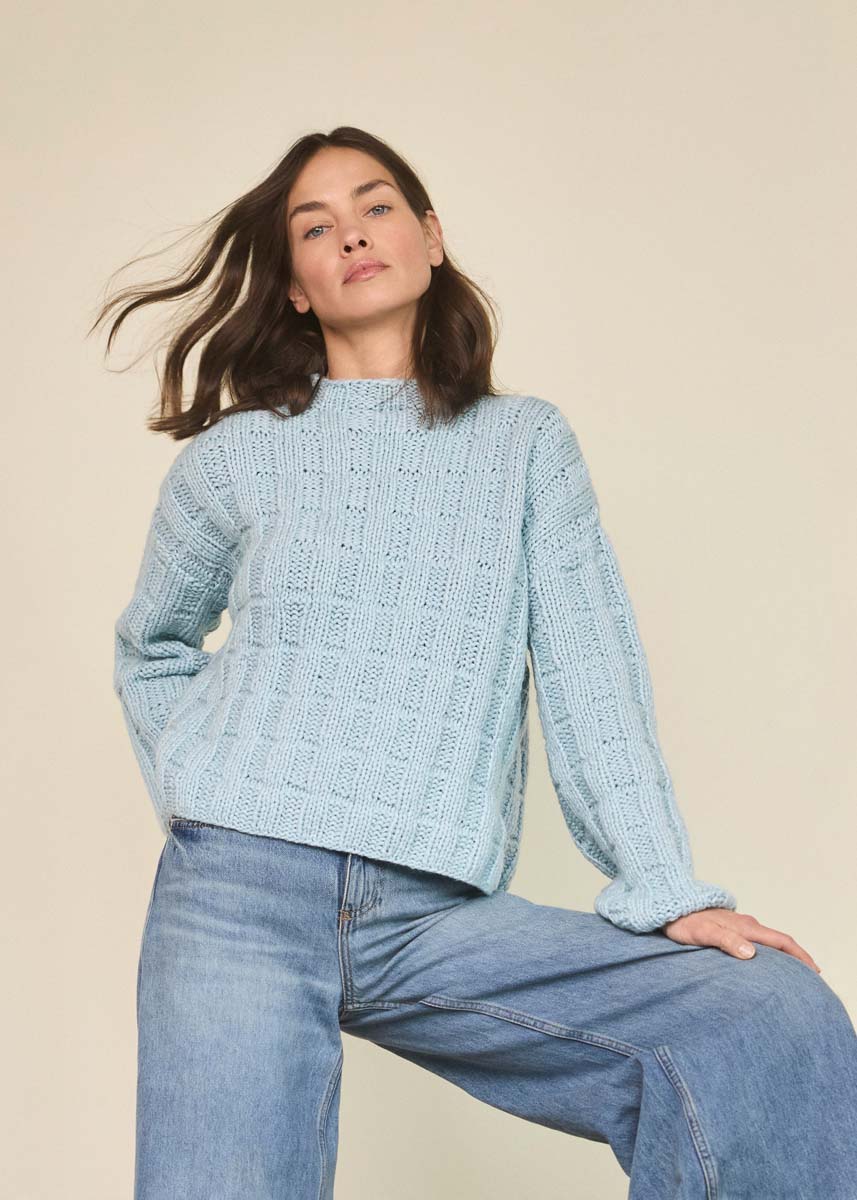 Lana Grossa-Qualität „Winter Softness“ (62 % шерсть (меринос), 38 % хлопок (био), длина нити = ca 70 m/50 g): 550 (600–650–700) г синяя мята (цв 2); сп. № 6 и 7; кр. сп. № 6.