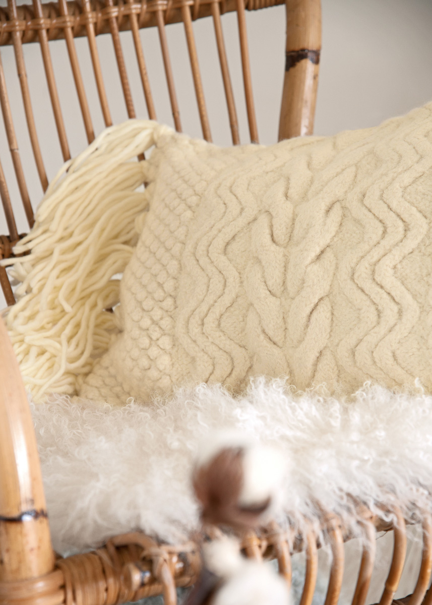 Lana Grossa Feltro (100% шерсть, длина нити 50 m/50 g), 850 г чисто белый (цв 1); 1 сп. № 8, 1 крючок №. 6, 1 подушка 60 x 40 см