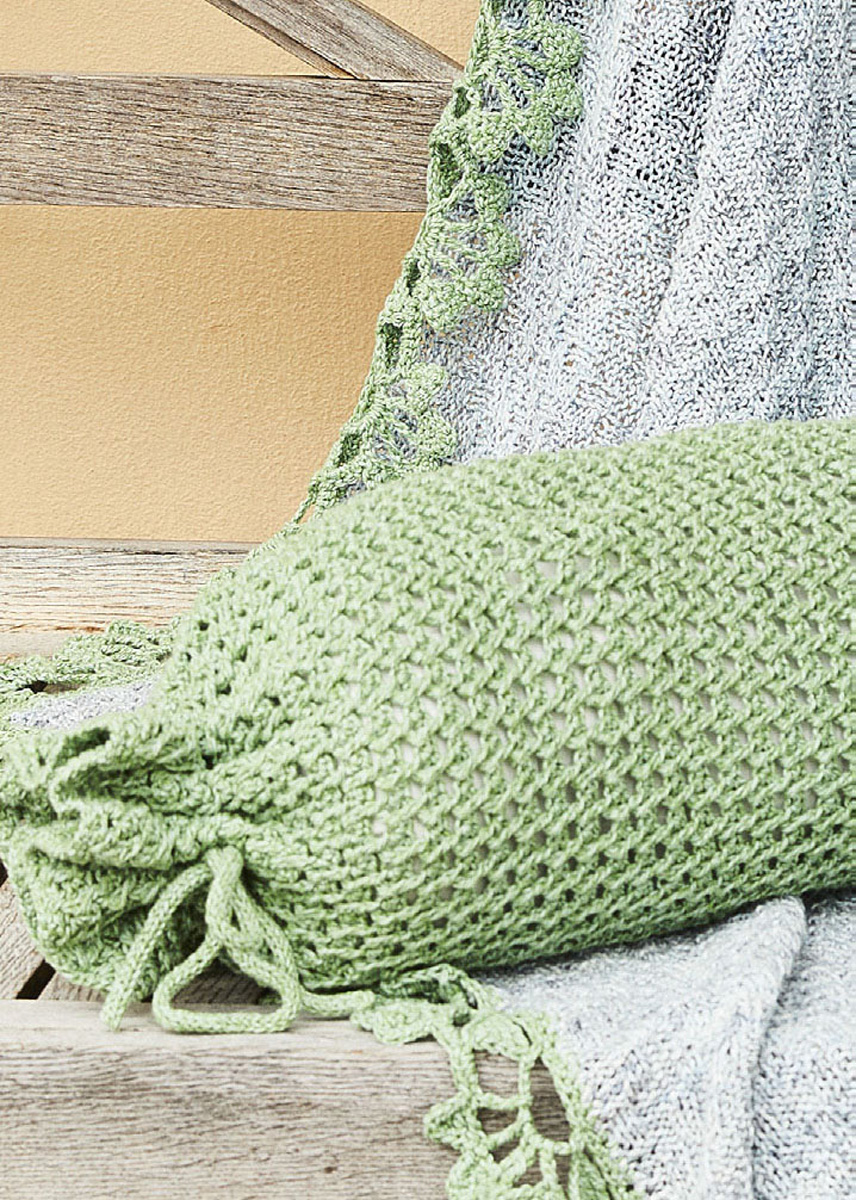 Lana Grossa-Qualität „Landlust-Sommerseide“ (50% шёлк, 50% хлопок, длина нити 170 m/ 50 g), 250 г зелёное яблоко (цв 36); 1 крючок № 3, 1 наполнение подушки, 45 см, 16 см Ø