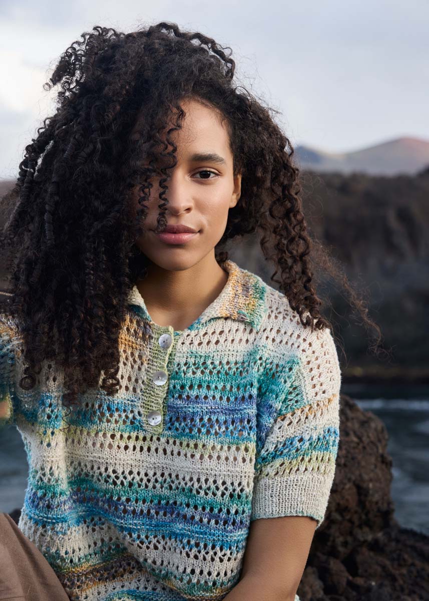 Lana Grossa-Qualität „Gomitolo Hippie“ (66 % хлопок, 30 % конопля, 4 % лён, длина нити = ca 300 m/100 g): 3 (4 - 4 - 4 - 5) мотки = ок 300 (400 - 400 - 400 - 500) г EAN: 4033493380539 (цв 3033); сп. № 2,5 и 3, 1 кр. сп. № 2,5; 3 пуговицы 17 мм