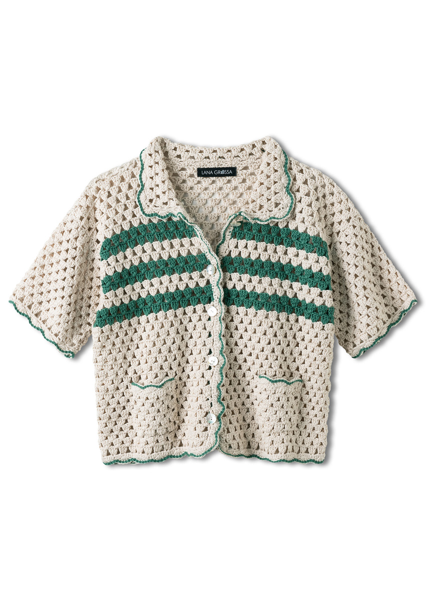 Lana Grossa-Qualität „Landlust Baumwolle” (100 % (био) хлопок, длина нити = ок. 115 m/50 g): ок. 400 (450) г натуральный (цв. 3) и ок. 50 г зеленый изумруд (цв. 9); 1 крючок № 3,5; 5 пуговицы, ø 18 мм