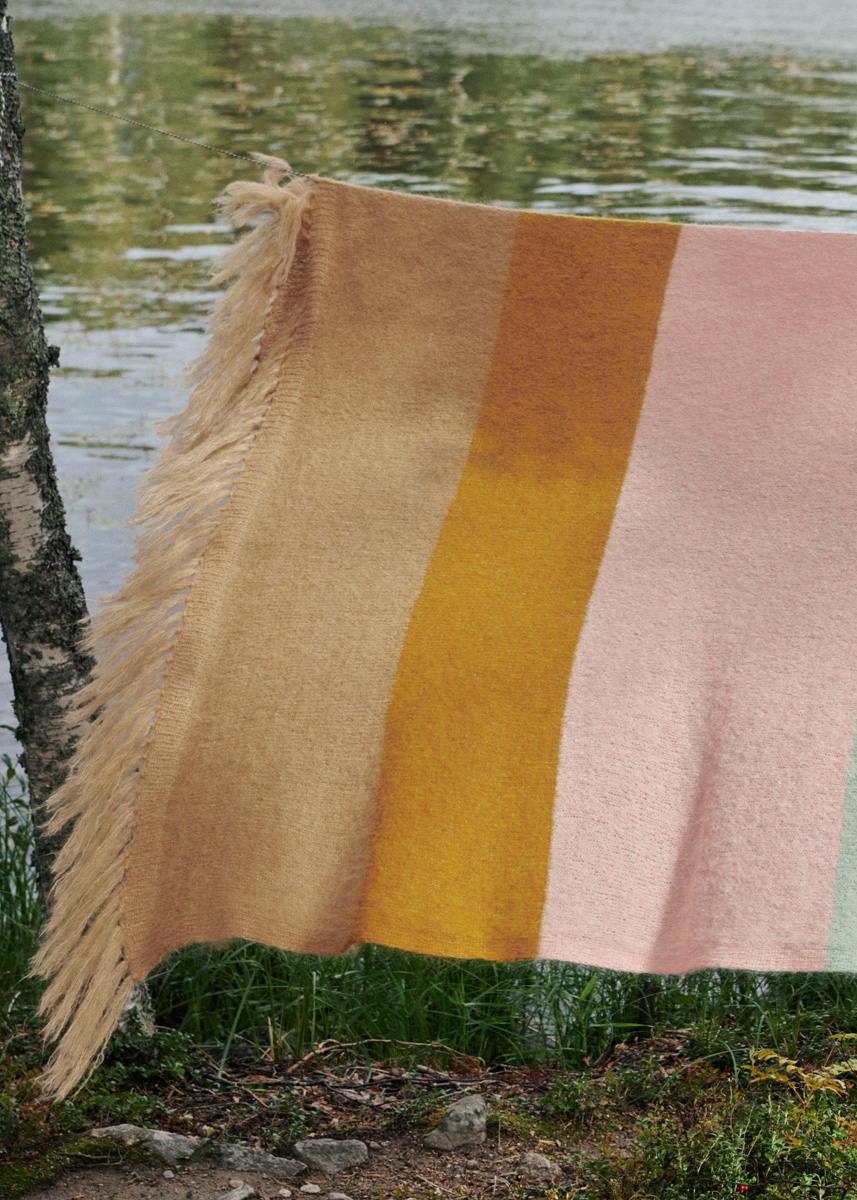 175 г цвета розо- вой пудры (цв. 26), 50 г бело-зеленой (цв. 42), 100 г нежно-розовой (цв. 8), 75 г цвета карри (цв. 22), 175 г цвета верблюжьей шерсти (цв. 19) пряжи Brigitte No. 3 (40% мохера (суперкид), 37% шерсти, 23% полиа- мида, 100 м/25 г) фирмы Lana Grossa; длинные круговые спицы № 4, крючок № 4,5