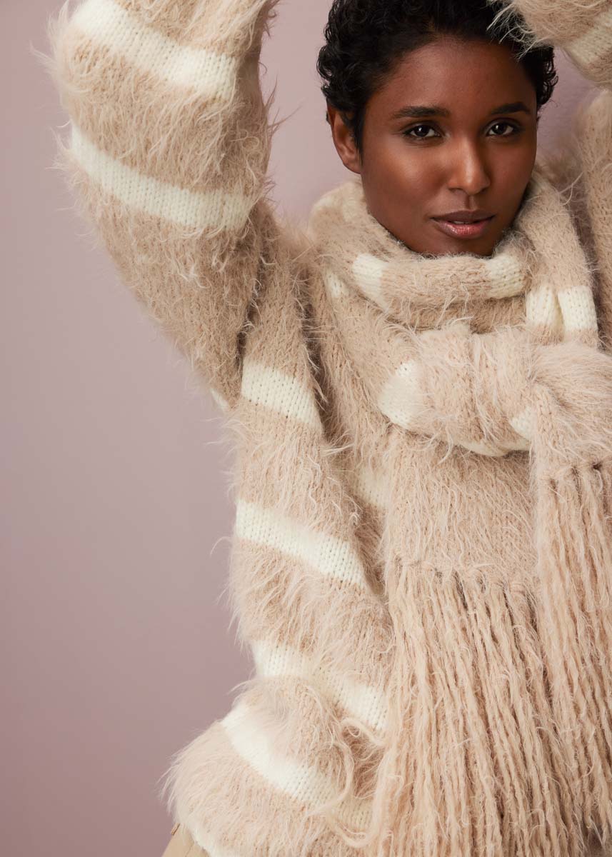 250 г бежевой (цв. 3) пряжи Basta (50% шерсти мерино, 50% полиамида, 100 м/50 г) и 100 г белой су- ровой (цв. 201) пряжи Cool Merino Big (90% шерсти мерино, 10% полиамида, 90 м/50 г) фирмы Lana Grossa; прямые спицы № 8, крючок № 7 для привязывания кистей.