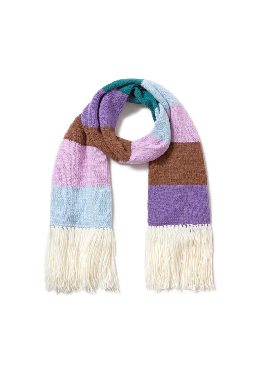 по 50 г светло-синей (цв. 65), сиреневой (цв. 63), шоколад- но-коричневой (цв. 68), цвета фиалки (цв. 62), темно-зеленой (цв. 28) и белой суро- вой (цв. 16) пряжи Brigitte No. 2 (47% альпака бэби, 45% хлопка, 8% шерсти мерино, 140 м/50 г) фирмы Lana Grossa; прямые спицы № 5,5, крючок № 5.