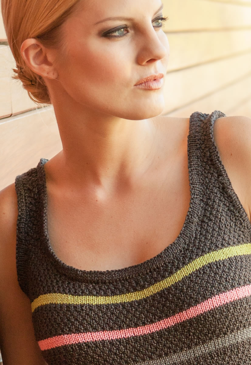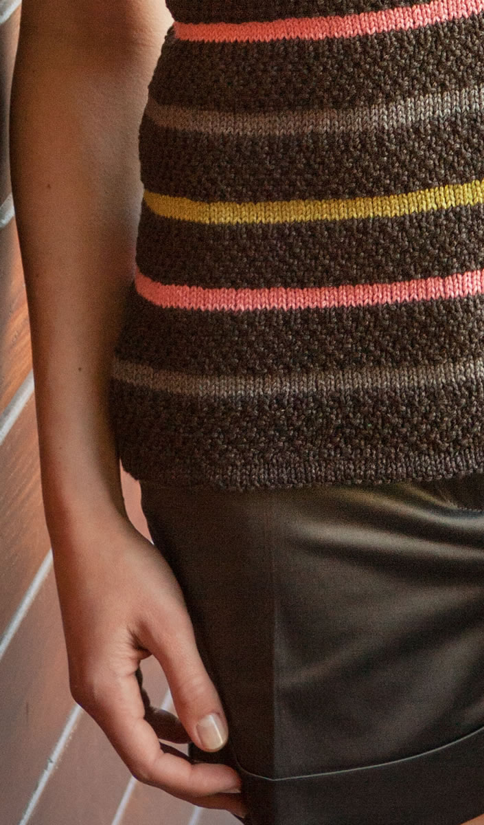 Спортивные полосы в этом сезоне на пике моды. Здесь они совсем тонкие, создающие изощренные цветовые контрасты. Топ выполнен из смесовой льняной пряжи с матовым блеском.