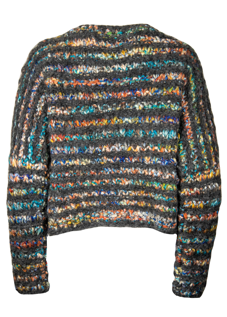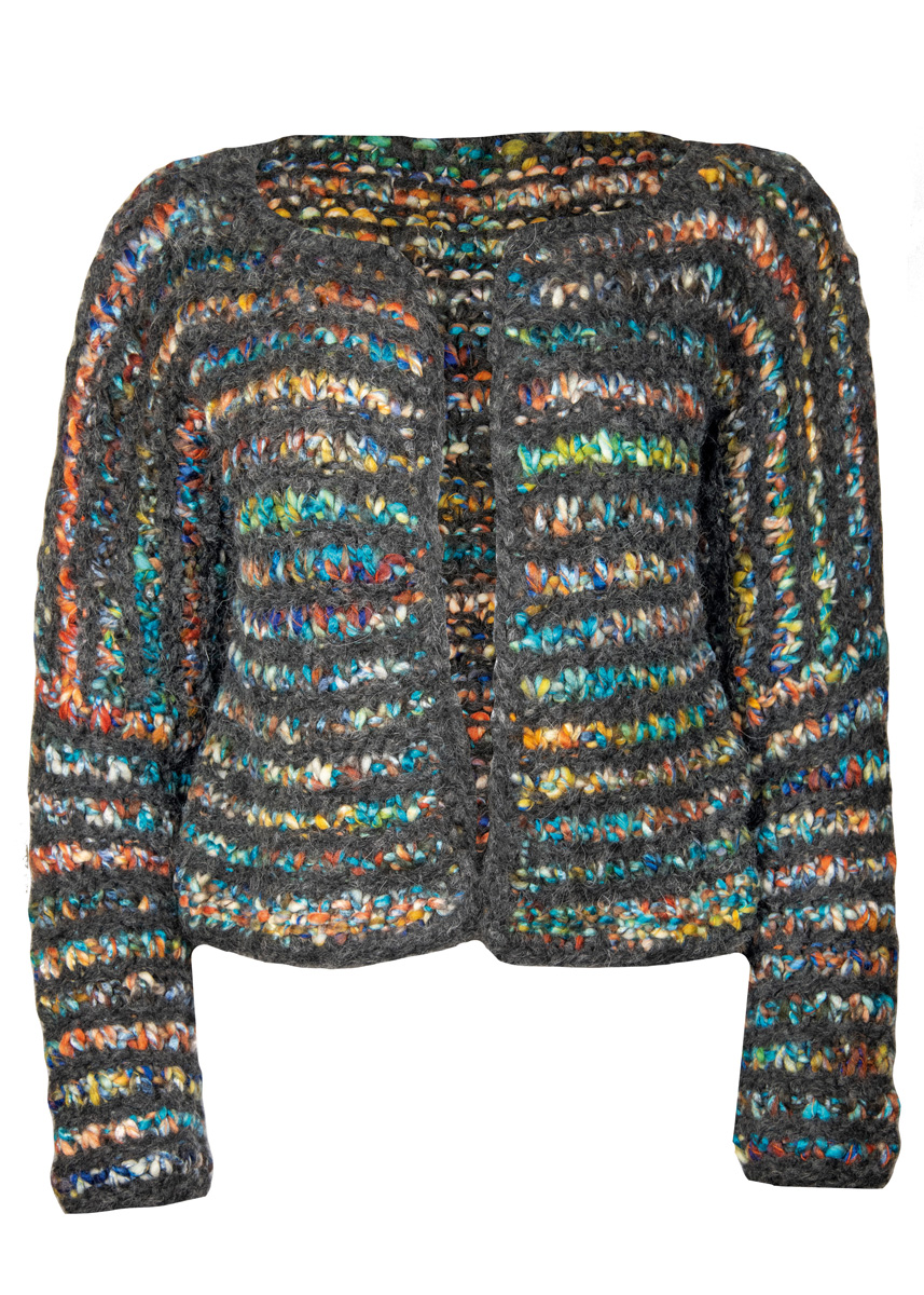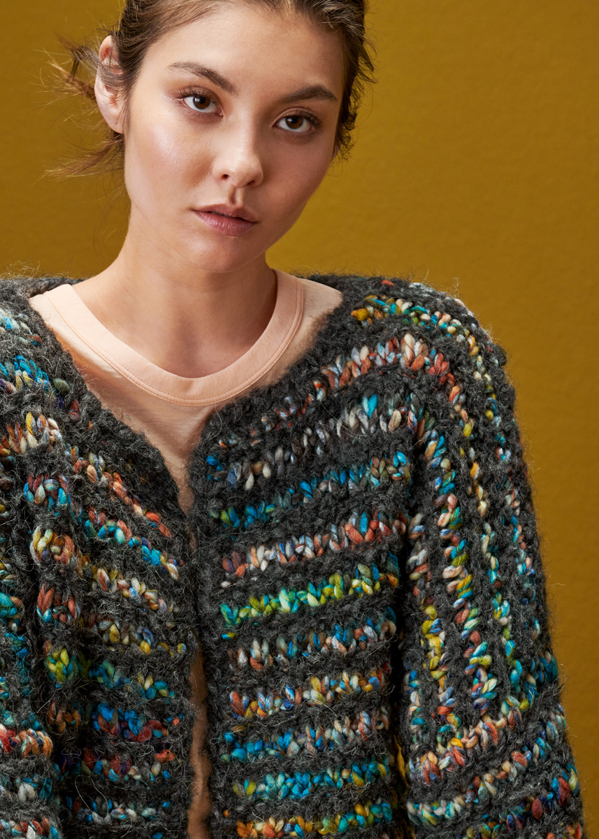 200 (250) г цвета антра- цита (цв. 10) пряжи Lala Berlin Furry (90% шерсти (ягненка) альпака, 10% полиамида, 75 м/50 г) и 500 (600) г синей/коричне- вой/бирюзовой/цвета ржавчины/горчичной (цв. 7) пряжи Allegra (52% шерсти, 48% полиакрила, 50 м/100 г) фирмы Lana Grossa; прямые спицы № 10, круговые спицы № 10 длиной 120 см, крючок № 8