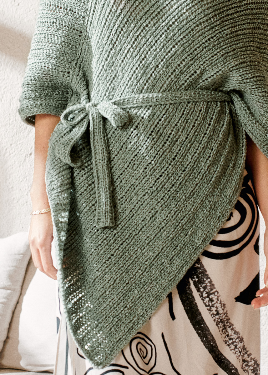 600 (700) г серо-зеленой (цв. 12) пряжи Cara (57% шерсти (ягненка) альпака, 33% хлопка, 10% овечьей (мери- носовой) шерсти, 120 м/50 г) фирмы Lana Grossa; прямые спицы № 3,5