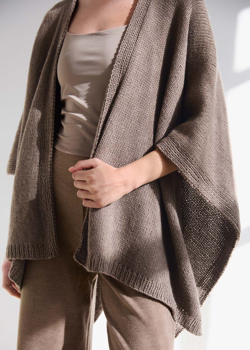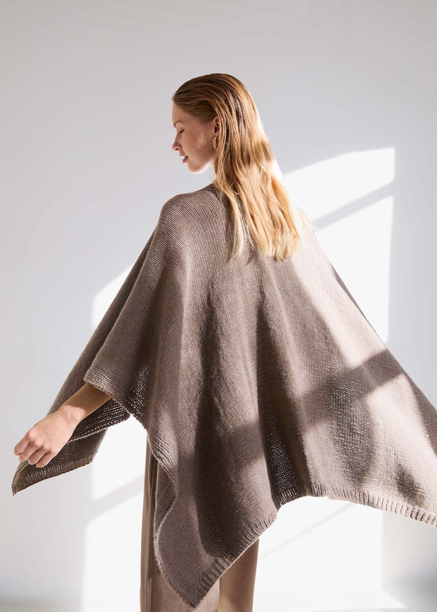 600 (650) г розовато-коричневой (цв. 103) пряжи Cashmere Kiss (70% шерсти мерино суперфайн, 30% кашемира, 70 м/25 г) фирмы Lana Grossa; круговые спицы № 5,5 и № 6 длиной 80 см