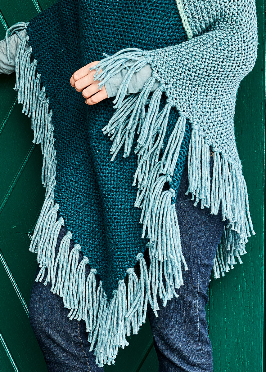 Lana Grossa-Qualität „Landlust Winterwolle“ (50% шерсть меринос 35% хлопок, 15% як, длина нити 70 m/50 g), 350 г петроль меланжевый (цв 13), 250 г темно сине-зеленый меланжевый (цв 18) и 50 г мята меланжевый (цв 17); сп. № 9, 1 крючок № 7