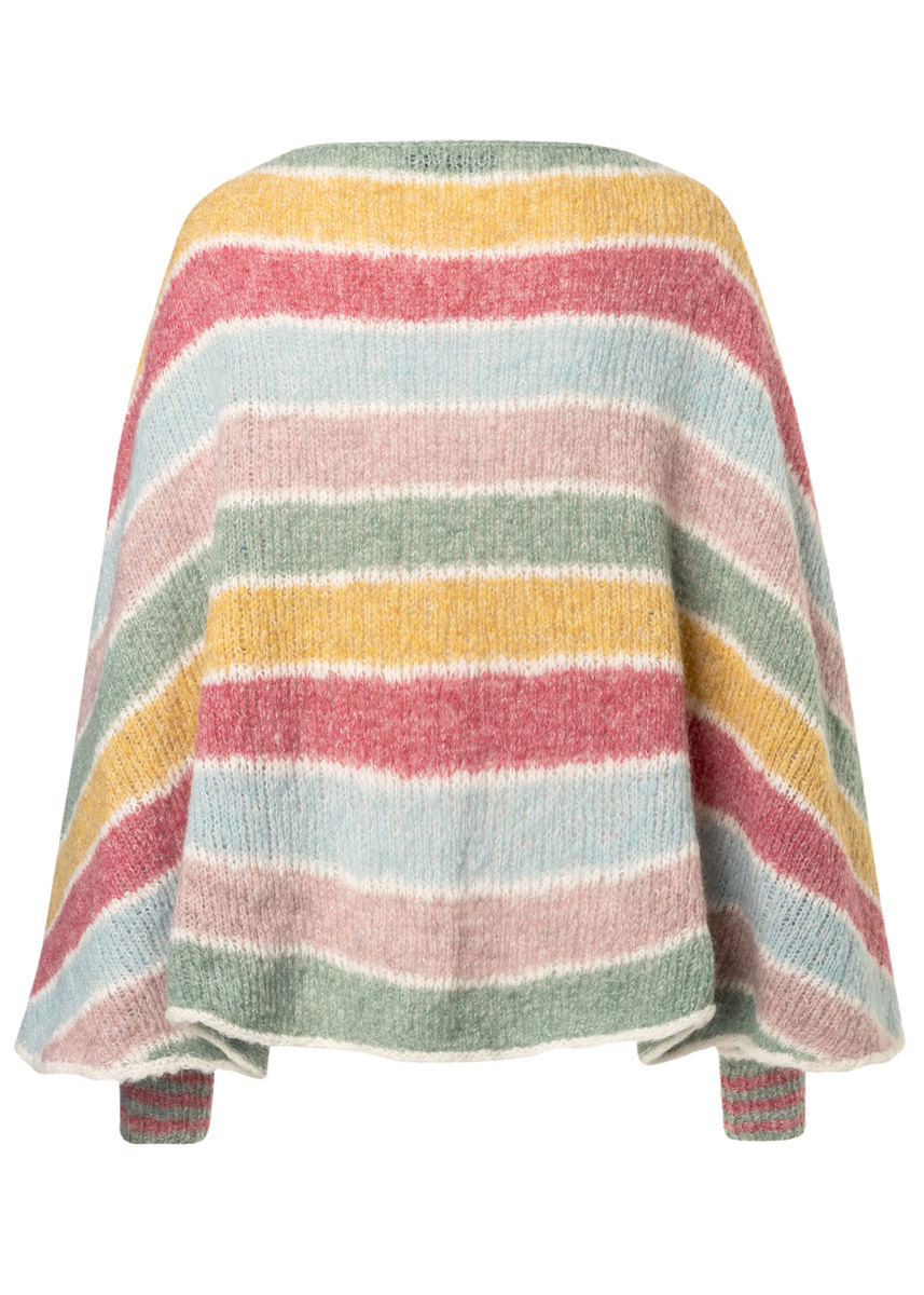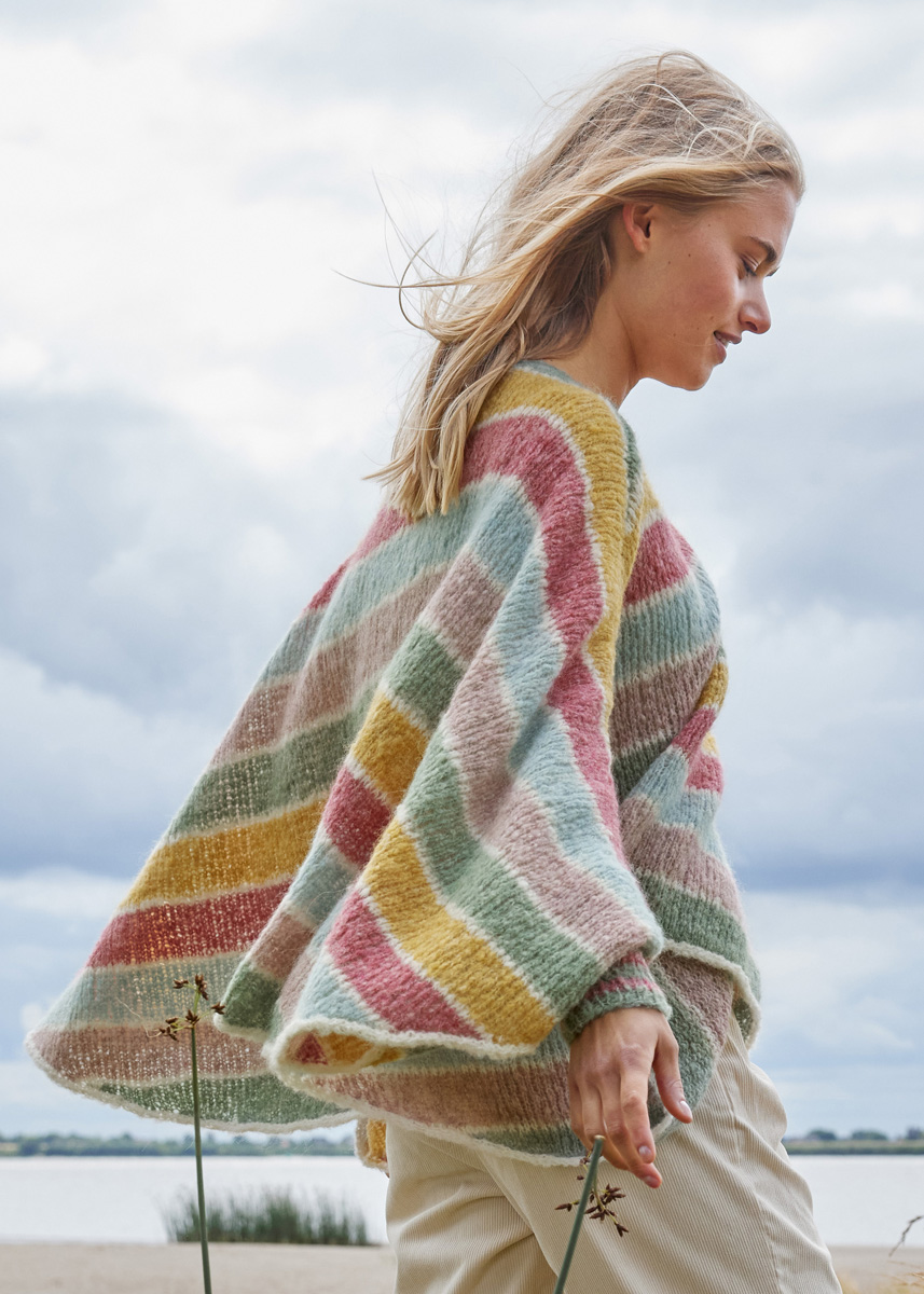 100 (125) г серо-зеле- ной (цв. 8), 75 (100) г ярко-розовой (цв. 4), 50 (75) г белой суровой (цв. 1), 50 (75) г цвета мяты (цв. 7), 50 (75) г цвета увядшей розовой розы (цв. 5) и 50 (75) г желтой (цв. 10) пряжи Più Bella (59% альпака бэби, 20% полиамида, 15% кашемира, 6% шерсти ме- рино, 100 м/25 г) фирмы Lana Grossa; кру- говые спицы № 4,5 длиной 100 см, прямые спицы № 3,5 и крючок № 3,5