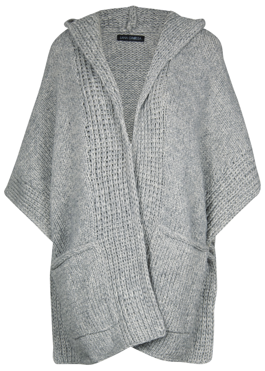 800 г светло-серой (цв. 5) пряжи Lala Berlin Lovely Cotton (75% овечь- ей шерсти (мериносовой шерсти супер- файн), 25% хлопка, 90 м/50 г) фирмы Lana Grossa; прямые спицы № 7, круговые спицы № 6 и № 7 длиной 80 см; 6 прозрачных при- шиваемых кнопок диаметром 25 мм