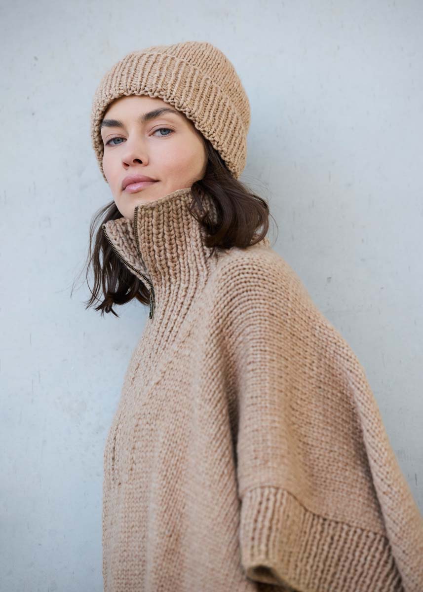 Lana Grossa-Qualität „Winter Softness“ (62 % шерсть (меринос), 38 % хлопок (био), длина нити = ca 70 m/50 g): 750 (800–850–900) г бежевый (цв 18); сп. № 6 и 7; 1 молния 40 см; крючок № 7.