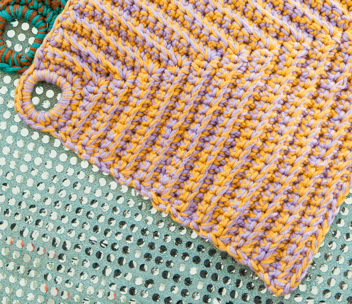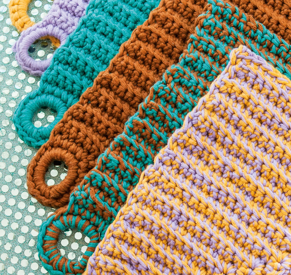 по 150 г кукурузно-желтой (цвет 36) или изумрудной (цвет 40) или коричневой (цвет 39) или лавандовой (цвет 41) пряжи Star фирмы Lana Grossa (100% хлопка, 90 м/50 г); для одноцветных прихваток потребуется по 100 г пряжи одного цвета, для меланжевых прихваток — по 50 г каждого цвета; 1 вязальный крючок № 4,5.